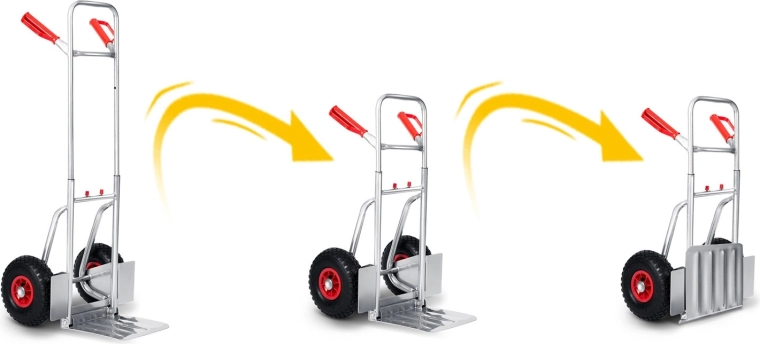 Den nederste platform klappes hurtigt op, og sækkevognen kan nemt lægges i bilens bagagerum eller på en hylde – ideel til bude og flytning.
