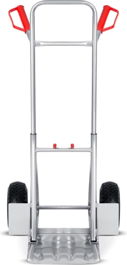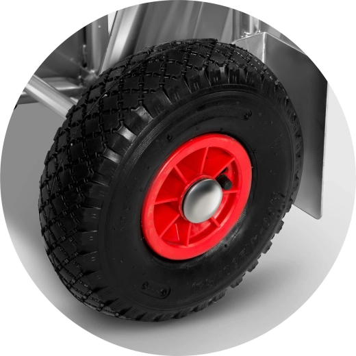 Store oppustelige hjul med ventiler og metalforstærkning sikrer jævn transport af last over tærskler, fliser og grovere overflader.