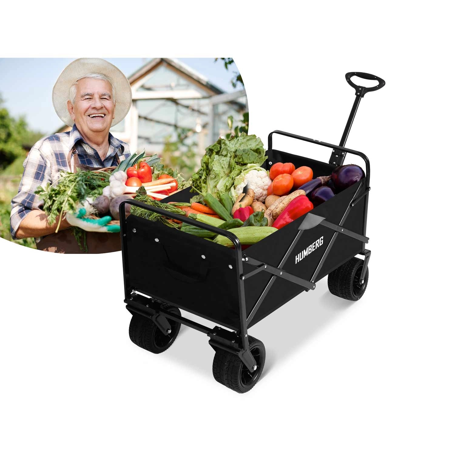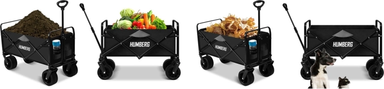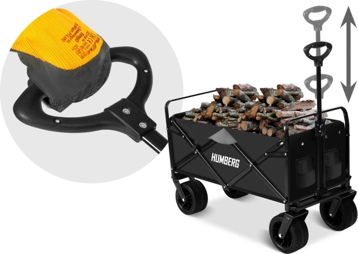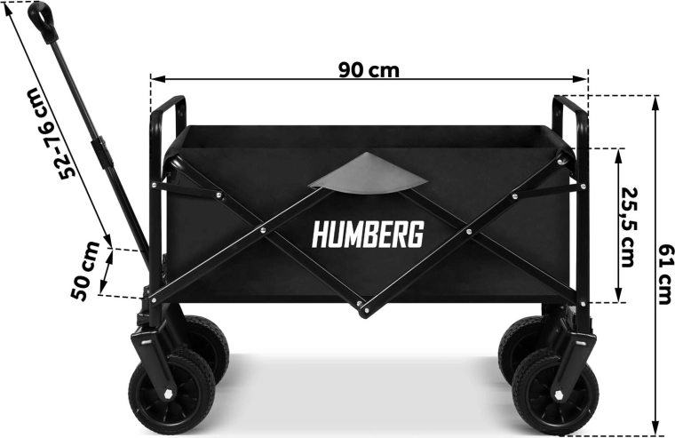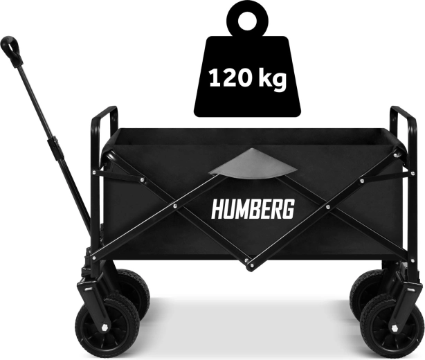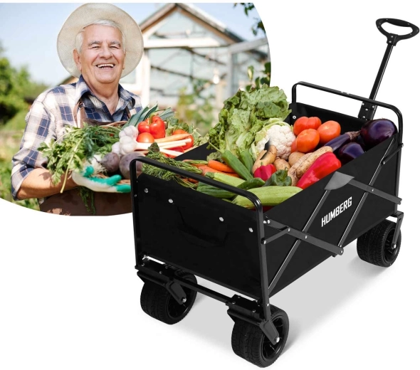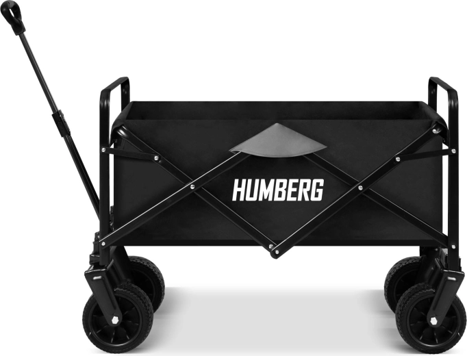 Den sammenklappelige HUMBERG-vogn er det ideelle valg til daglig brug – fra havearbejde og indkøb til weekendture. Den robuste stålramme med pulverlakering, den dybe tekstilkasse på 100 l og de store terrænhjul sikrer komfortabel og sikker transport af last op til 120 kg.