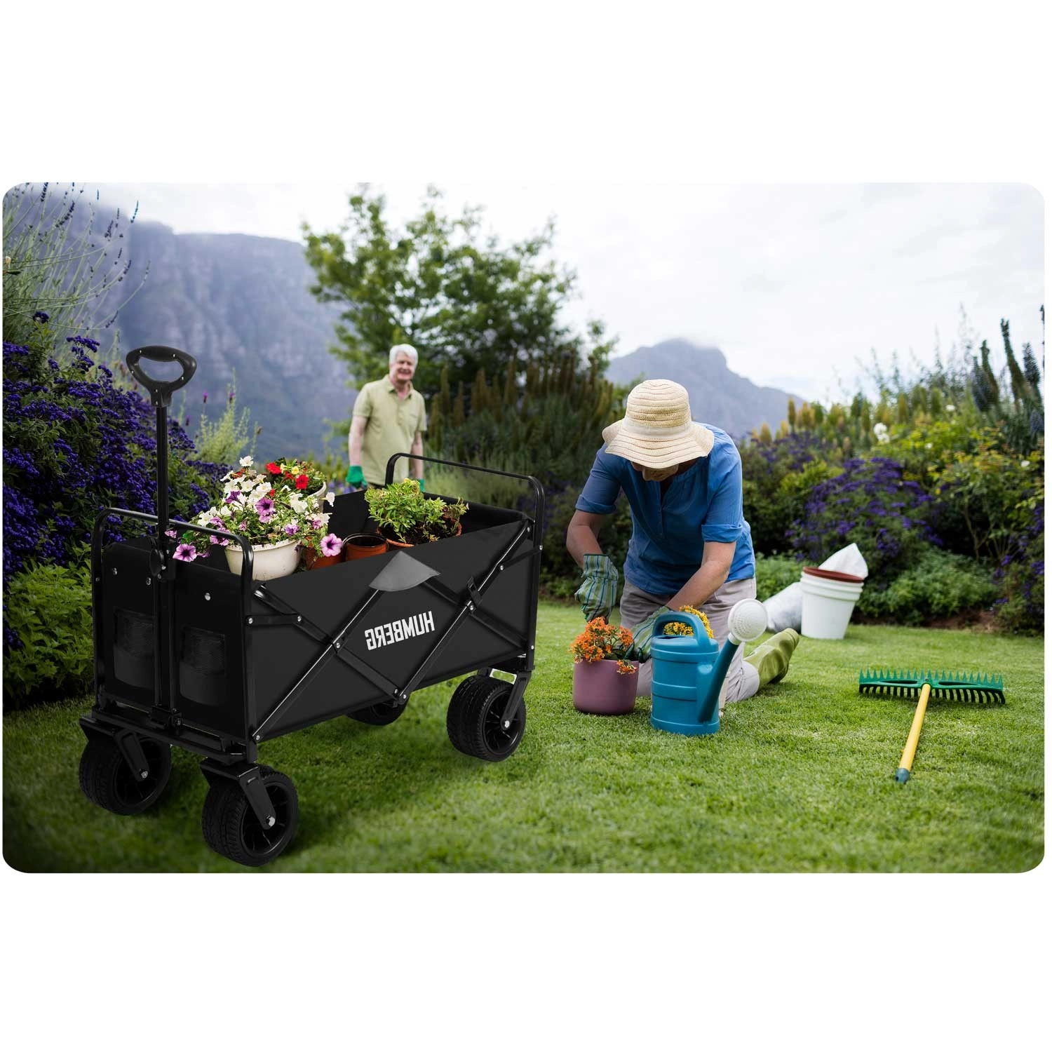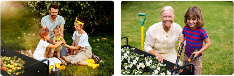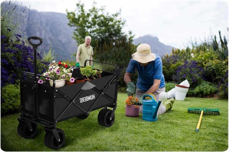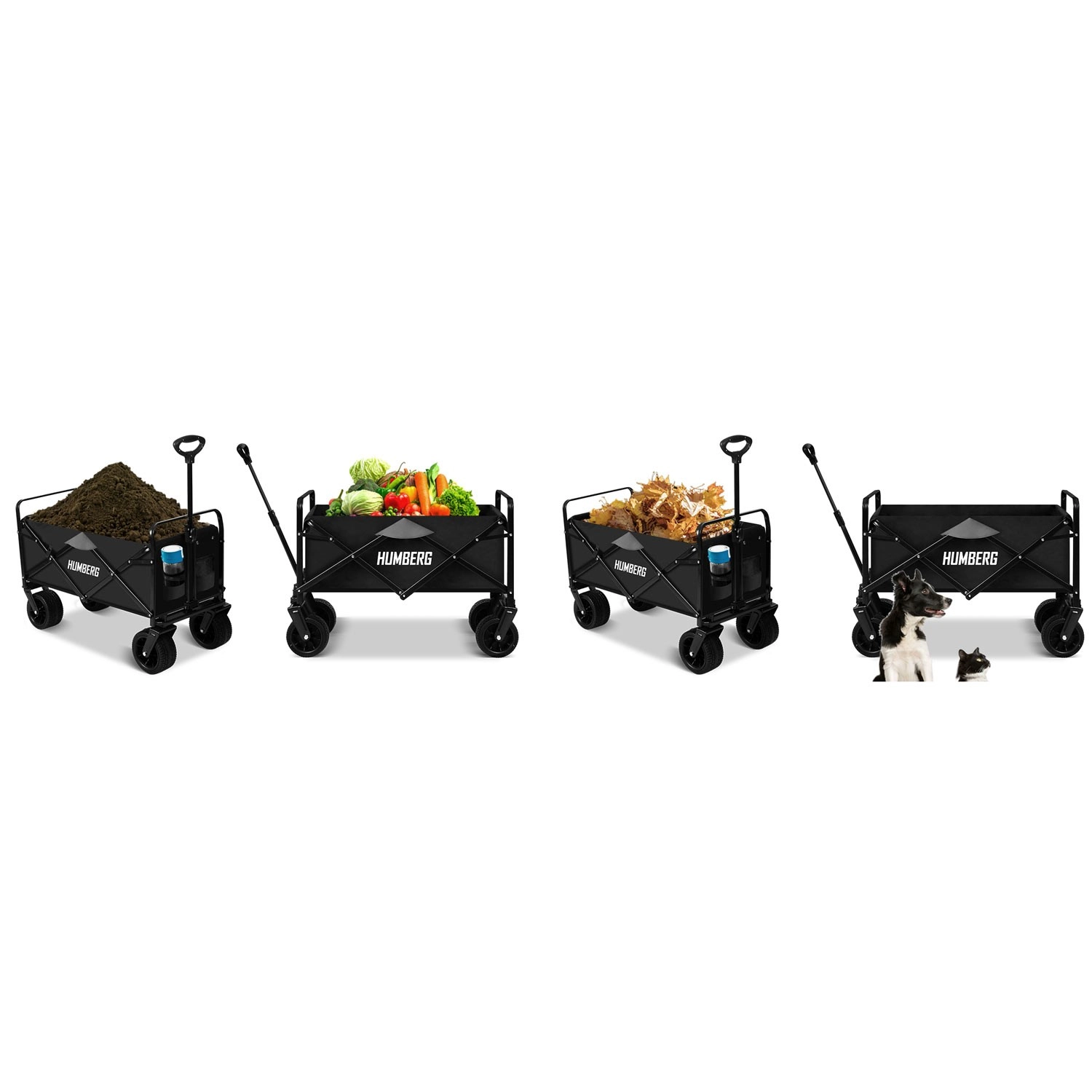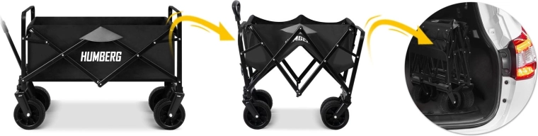 Den sammenklappelige HUMBERG-vogn er det ideelle valg til daglig brug – fra havearbejde og indkøb til weekendture. Den robuste stålramme med pulverlakering, den dybe tekstilkasse på 100 l og de store terrænhjul sikrer komfortabel og sikker transport af last op til 120 kg.