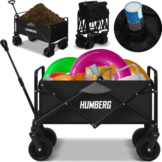 Praktisk sammenklappelig HUMBERG-vogn med et volumen på 100 l og en bæreevne på op til 120 kg, som gør det nemt at transportere last i haven, på stranden og på rejser. Takket være 360° svingbare hjul, teleskophåndtag og stabil stålkonstruktion er den let at manøvrere selv i ujævnt terræn. Hurtig sammenklapning, slidstærkt tekstil og praktiske kopholdere gør den til en uundværlig hjælper i hverdagen.