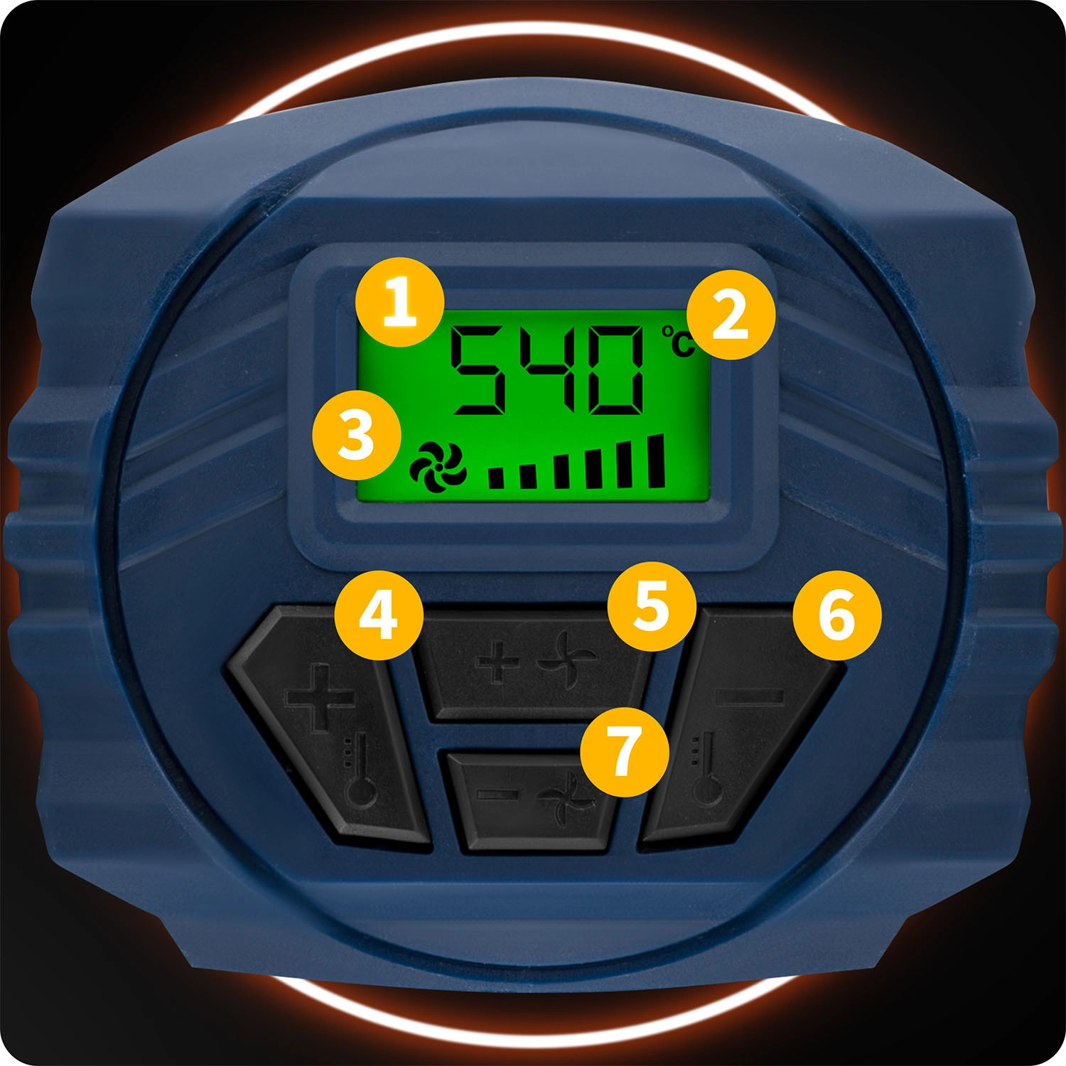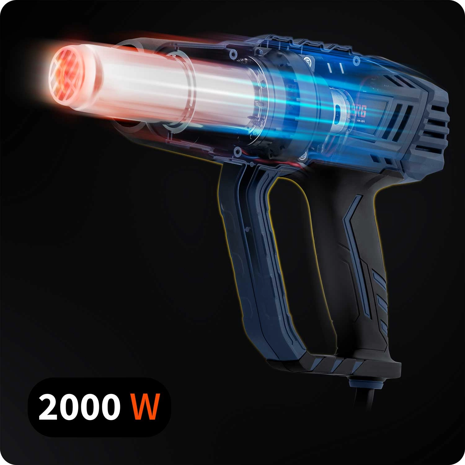 Den robuste, flerlagede konstruktion af varmeelementet og det termisk isolerede PP-hus modvirker overophedning af kabinettet. Det ergonomiske, gummibelagte håndtag med fingerbeskyttelse giver et sikkert greb. Der er 2 arbejdsfunktioner og op til 6 niveauer af luftstrøm på 300–500 l/min for perfekt tilpasning til opgaven. Nem betjening via en enkelt multifunktionsknap.