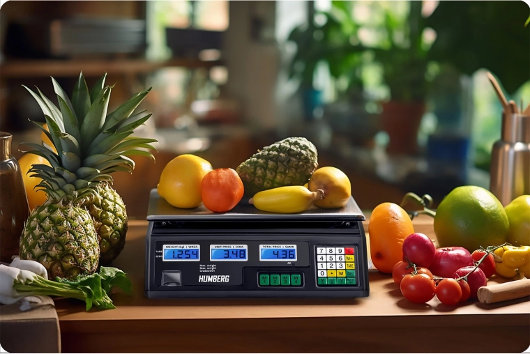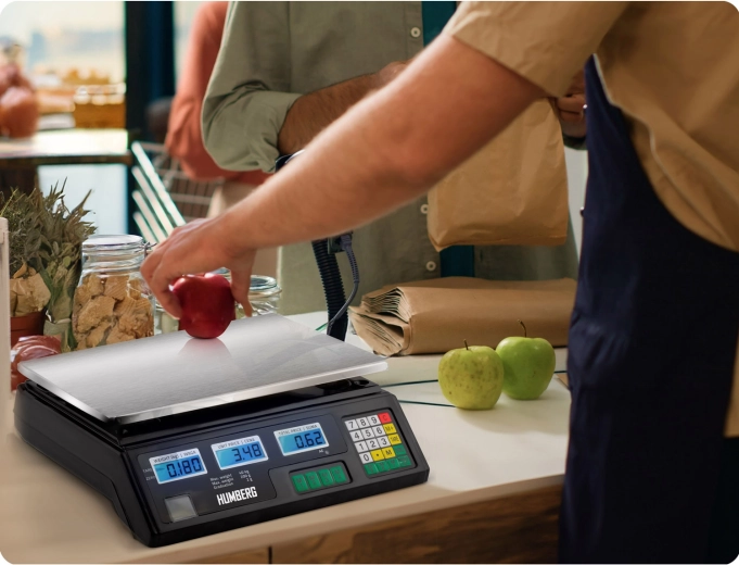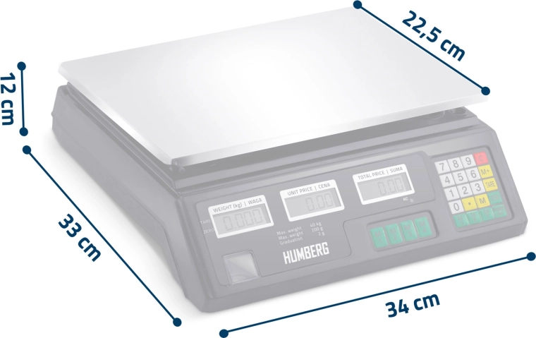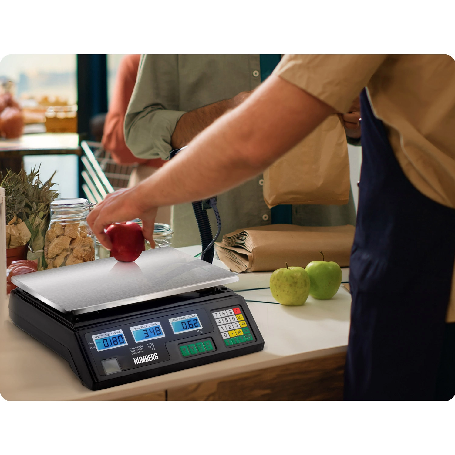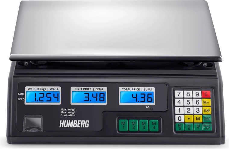 HUMBERG HM-190 er en pålidelig butiksvægt designet til hurtig og præcis vejning af frugt, grøntsager og pakkede produkter. Takket være det robuste kabinet i ABS-plast og den rustfri vejeplade tåler den krævende drift og er let at rengøre. Seks baggrundsbelyste LCD-skærme sikrer fremragende læsbarhed af vægt, stykpris og samlet beløb fra begge sider.