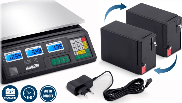 Praktiske funktioner omfatter hukommelse for seneste måling, lagring af op til 7 stykpriser, optælling af 1 til 99 varer, automatisk slukning og mulighed for sletning af hukommelsen. Strømforsyning via net (12 V) og de medfølgende to akkumulatorer 6 V 4Ah, hvor hver giver cirka 6–8 timers drift. Vægten er beregnet til intern brug uden officiel verifikation (legalisering).