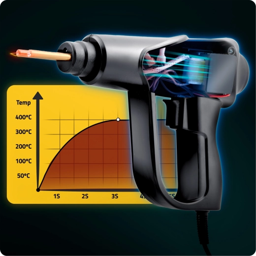 Den kraftige opvarmning sikrer, at du på blot 3 sekunder når en arbejdstemperatur på op til 400 °C og straks kan begynde at reparere de fleste almindelige plastmaterialer.