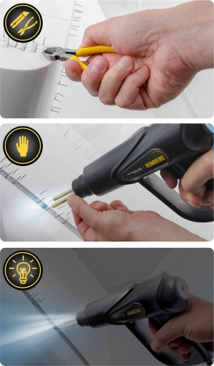 I sættet finder du 4 typer klammer (i alt 200 stk.) til lige revner, indvendige og udvendige hjørner samt mere omfattende skader. Takket være LED-lampe har du perfekt overblik over arbejdsområdet, og de medfølgende bidetænger og knæk-kniv gør den endelige finish nemmere.