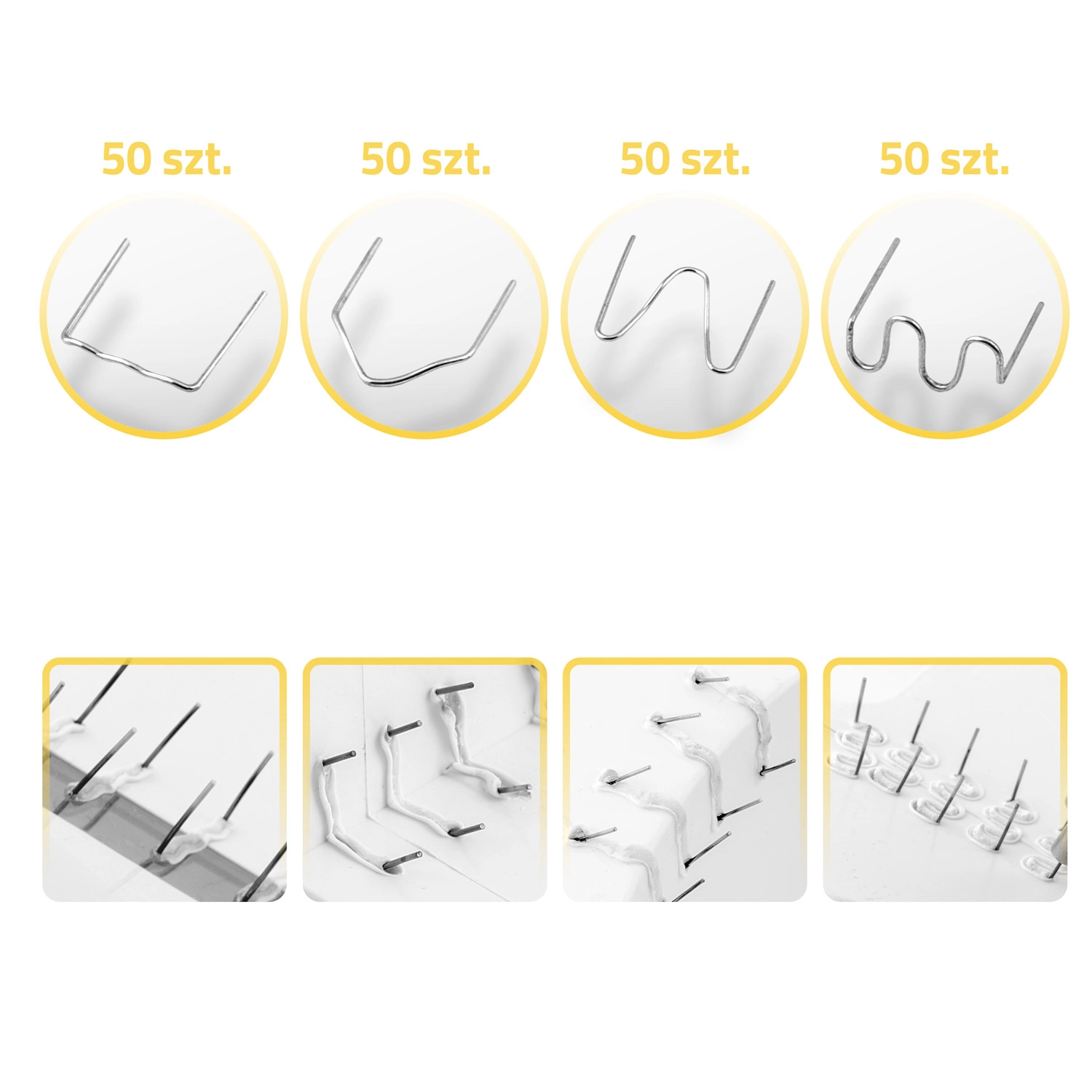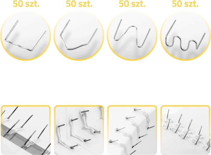 Sættet indeholder 200 klammer: flade med lille og stor radius, konvekse og konkave hjørneklammer – til langsgående og hjørnerevner samt mere omfattende brud.