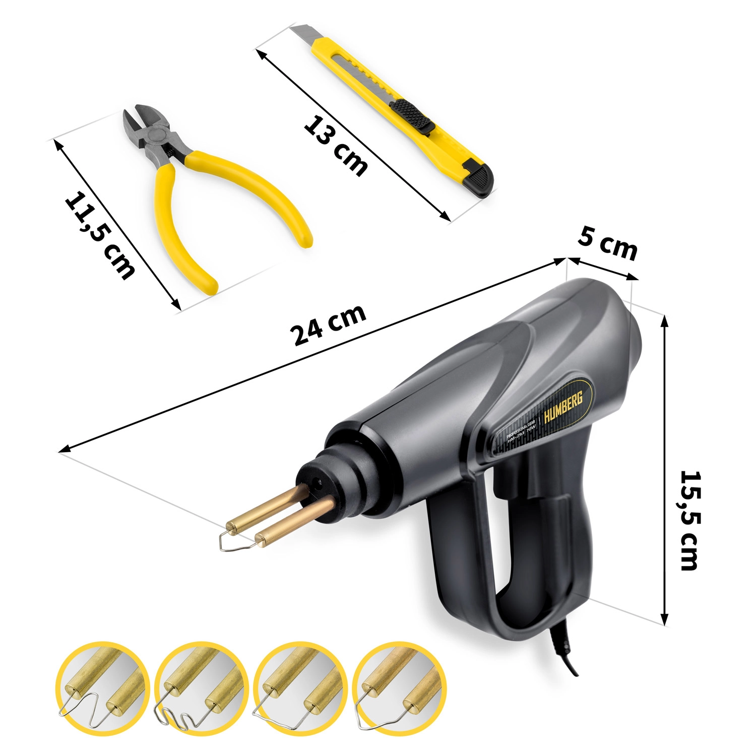 Kompakt plastsvejser HUMBERG 70 W i robust kuffert er en hurtig løsning til reparation af kofangere, lygter, instrumentbrætter og apparatdæksler. Den varmer op på 3 sekunder til op til 400 °C, håndterer mere end 98 % af plasttyper og leveres med 200 klammer i 4 typer, LED-lys, bidetænger og knæk-kniv til en ren finish.