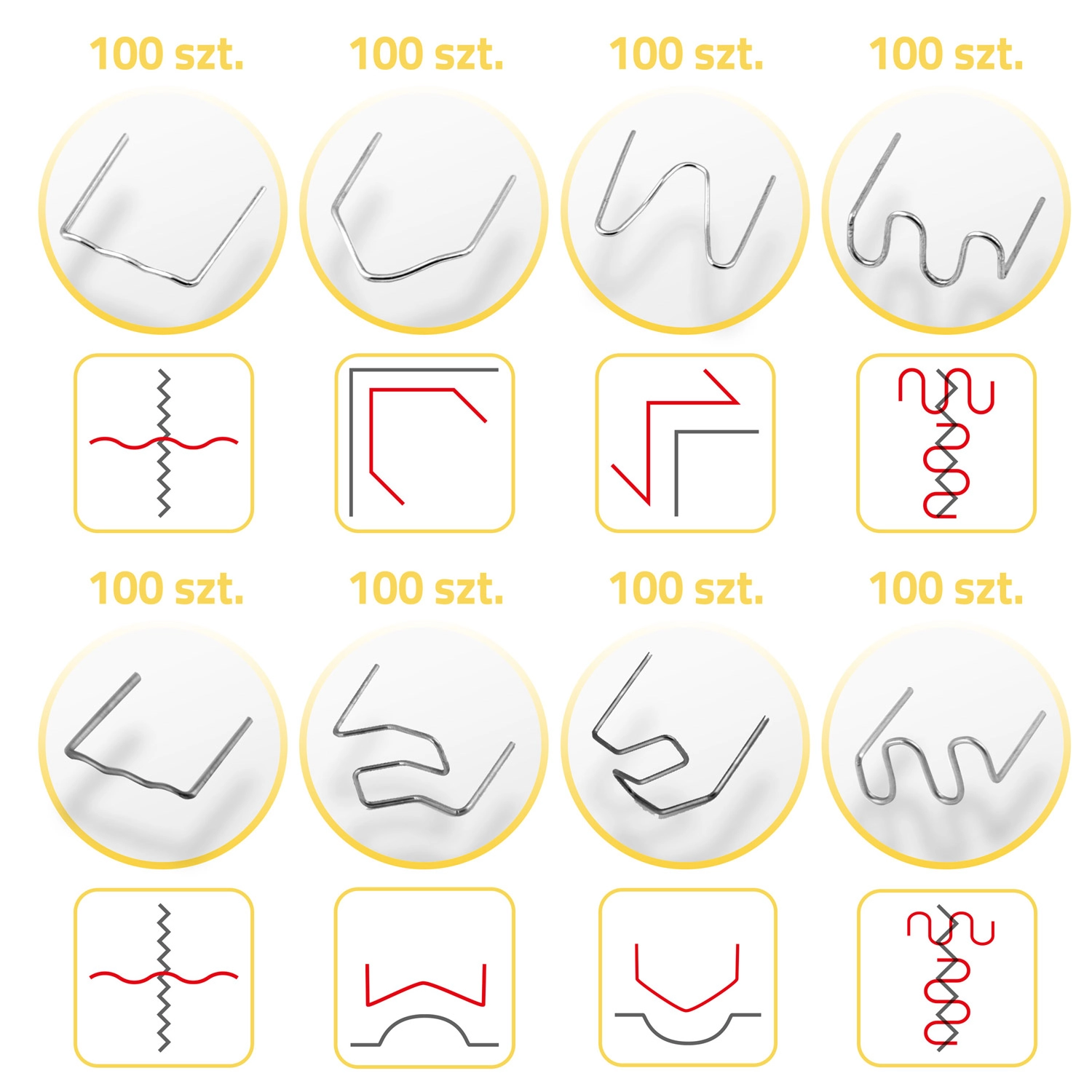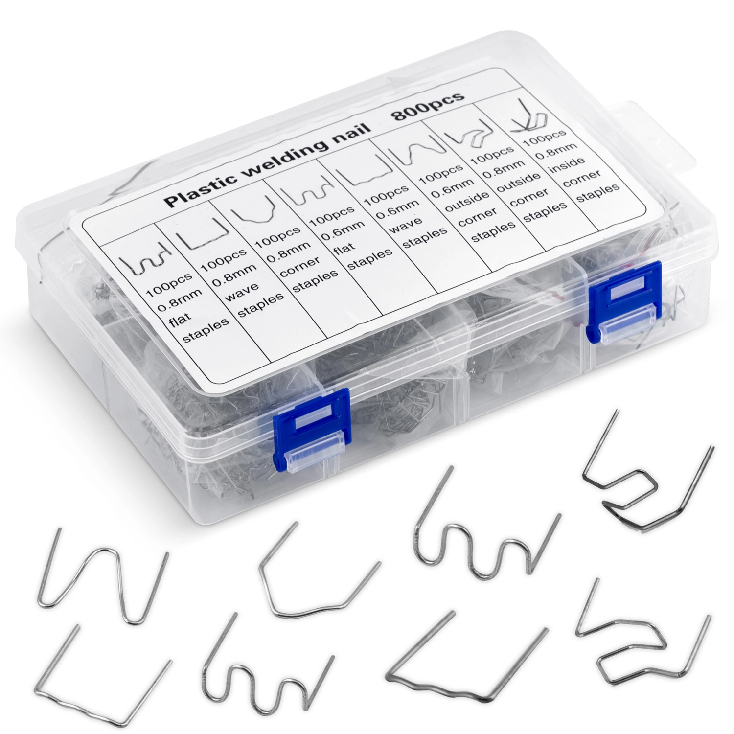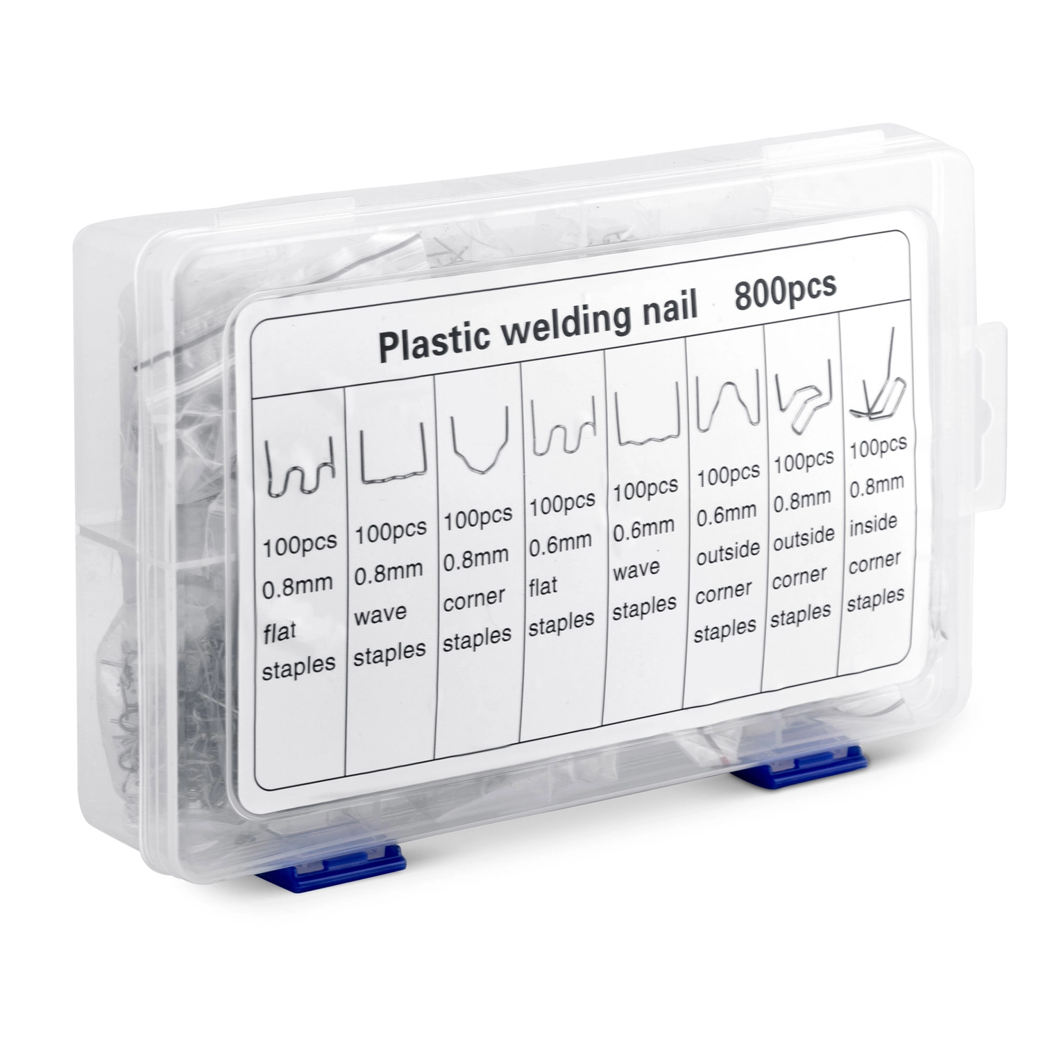 Sættets indhold er designet til at dække de mest almindelige typer plastskader – fra smalle revner til brede brud, indvendige og udvendige hjørner samt buede flader. Alt er opbevaret i en overskuelig kuffert, så du altid hurtigt finder den nødvendige klemmetype.