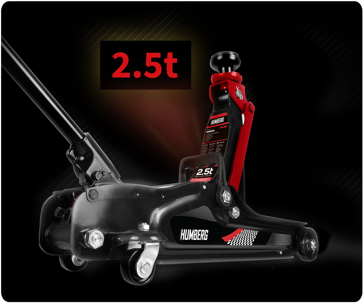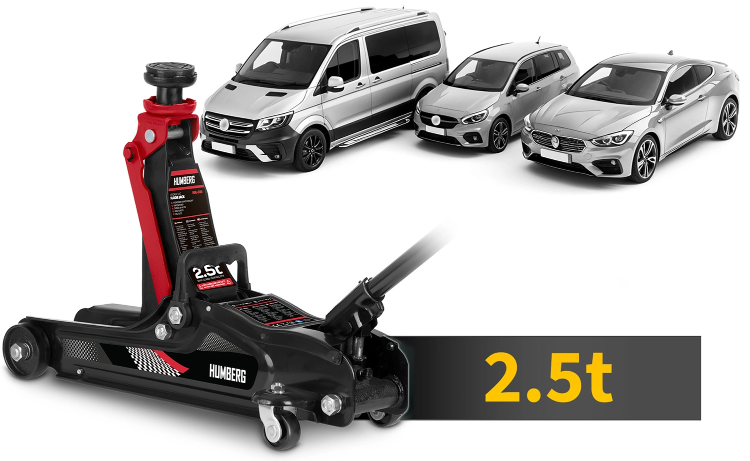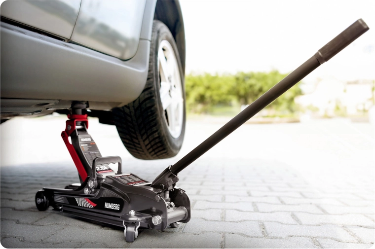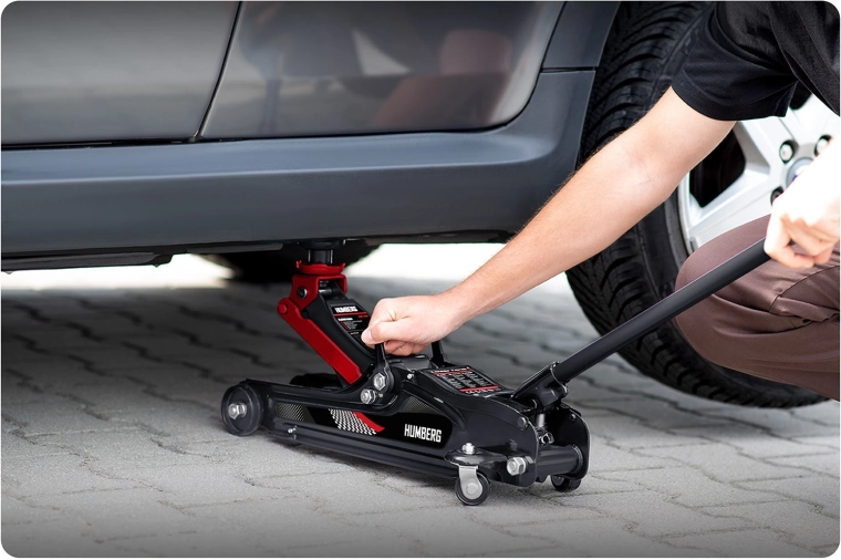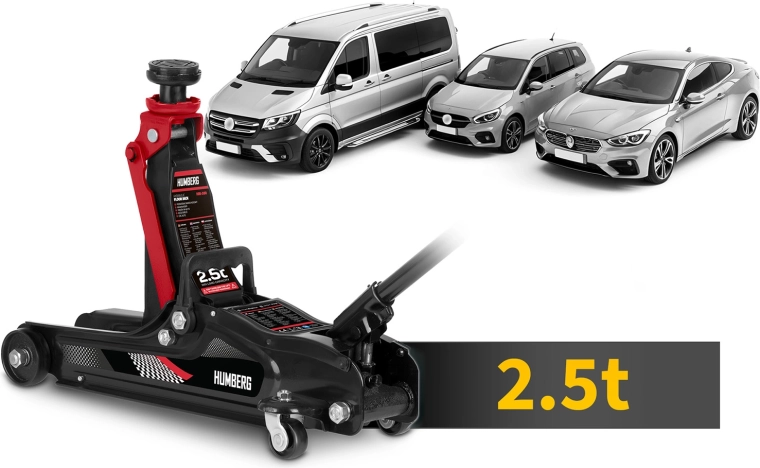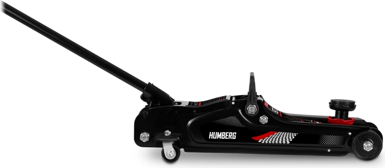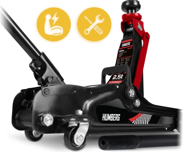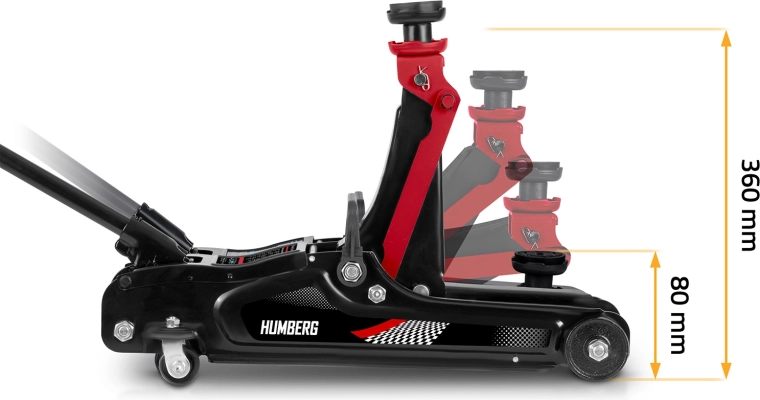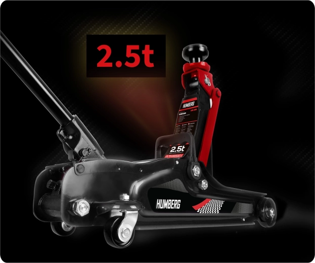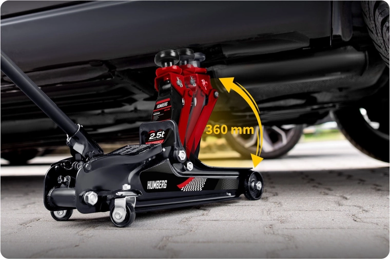 Den kraftige lavprofil hydrauliske donkraft fra HUMBERG med en løftekapacitet på 2,5 t løfter pålideligt personbiler og små varevogne. Takket være et løfteområde på 80–360 mm passer den også under lave biler, den har en stål‑aluminiums konstruktion, 360° drejelige hjul for nem manøvrering og indeholder udskiftelige gummipuder og et ekstra forhøjet stålhoved for bedre tilpasning til forskellige løftepunkter.