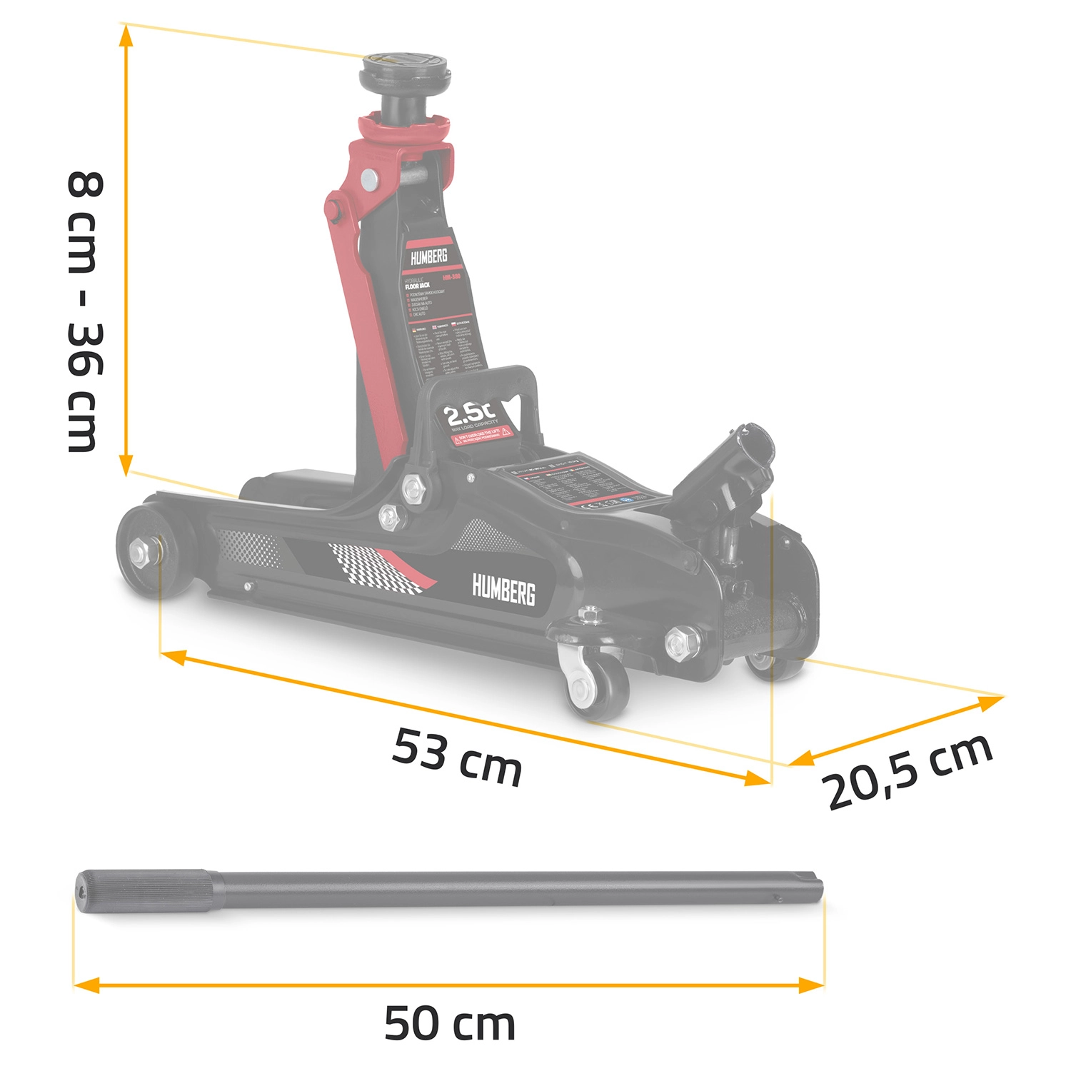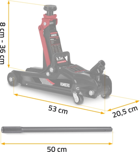 For maksimal alsidighed indeholder pakken 2 udskiftelige gummipuder (15 og 35 mm) samt et ekstra forhøjet stålhoved. Den lange 50 cm stang med skridsikker håndtering sikrer jævn og behagelig pumpning, mens de brede forhjul og de bagerste drejelige hjul med lejer gør det nemt at placere donkraften præcist under bilens løftepunkter.