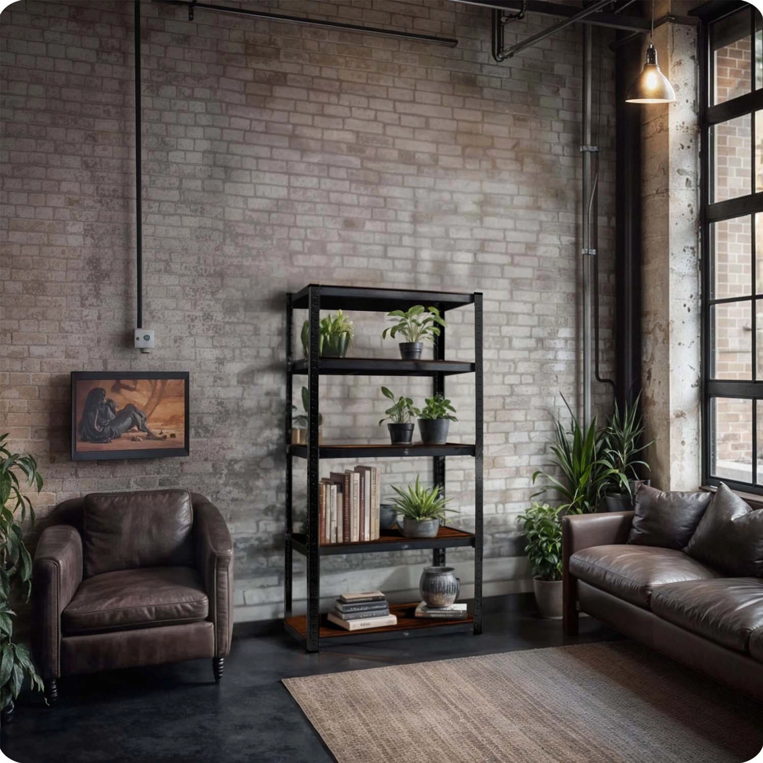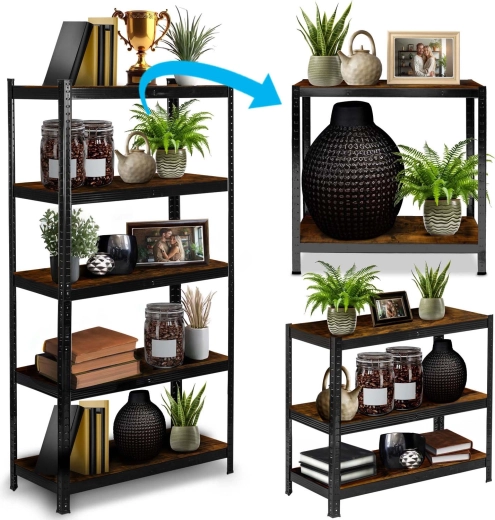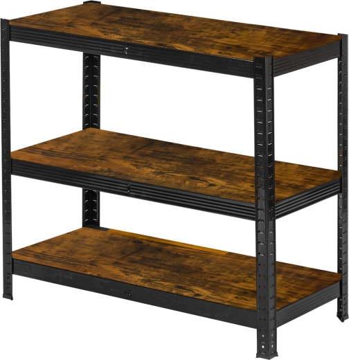 Galvaniserede stålprofiler med pulverlak i sort og rustikke MDF-hylder er lette at vedligeholde og passer til garage, værksted og moderne hjem.