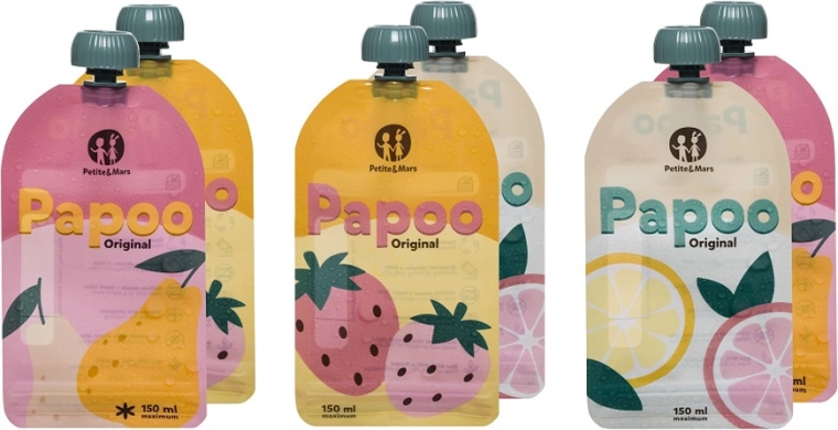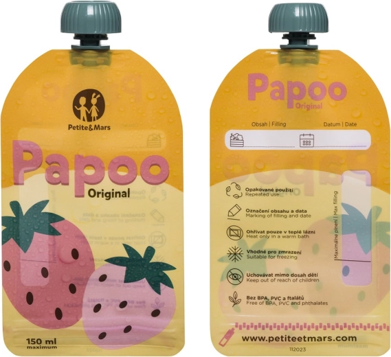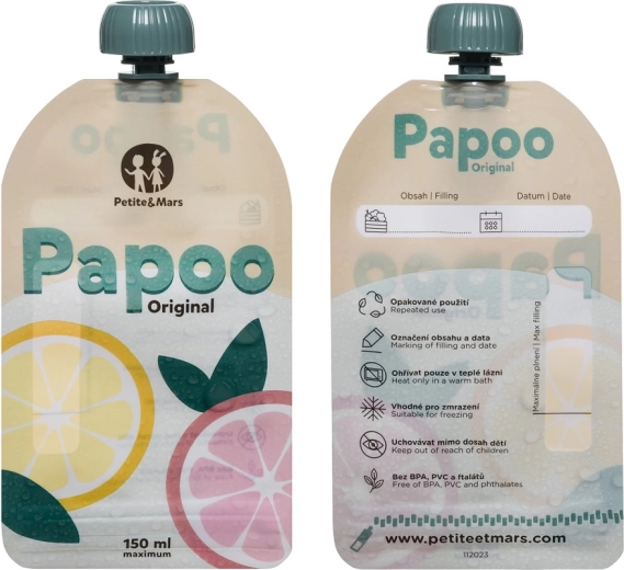 Praktiske og miljøvenlige PETITE&MARS Papoo Original poser med en kapacitet på 150 ml er ideelle til mos, puré og yoghurt på farten. De kan bruges igen og igen, tåler opvaskemaskine, kan fryses og er lette at mærke. Fri for skadelige stoffer BPA, PVC og ftalater og designet, så børn nemt kan spise selv uden rod.
