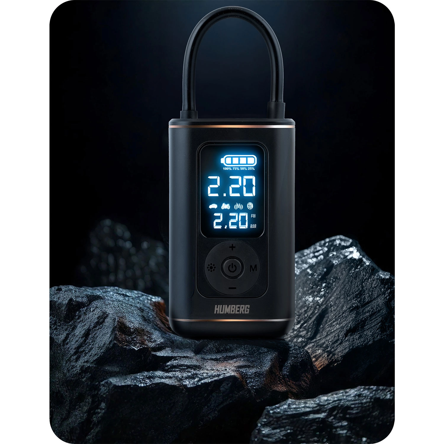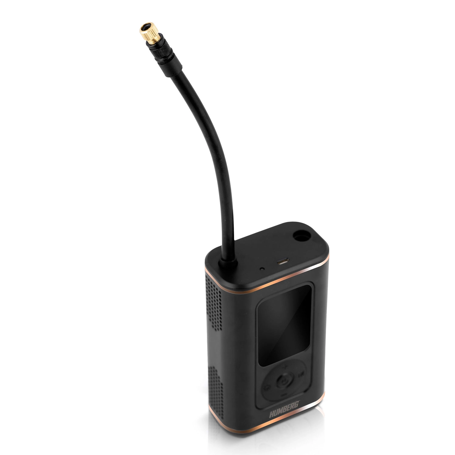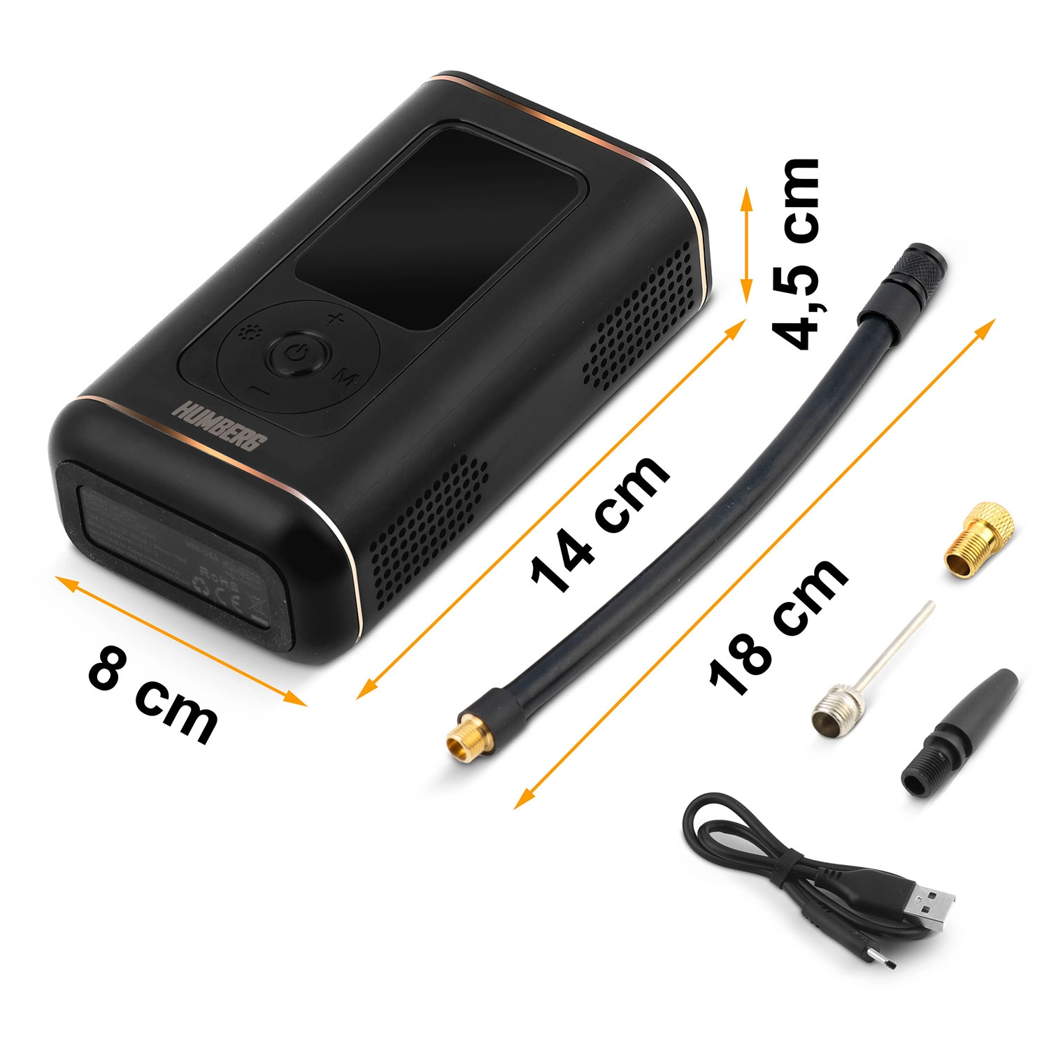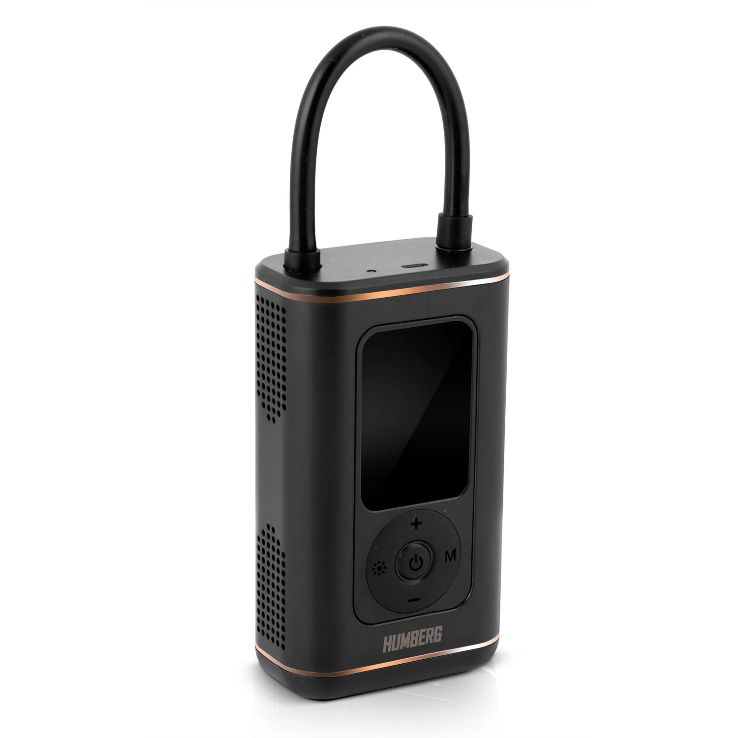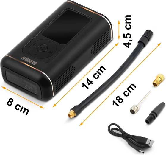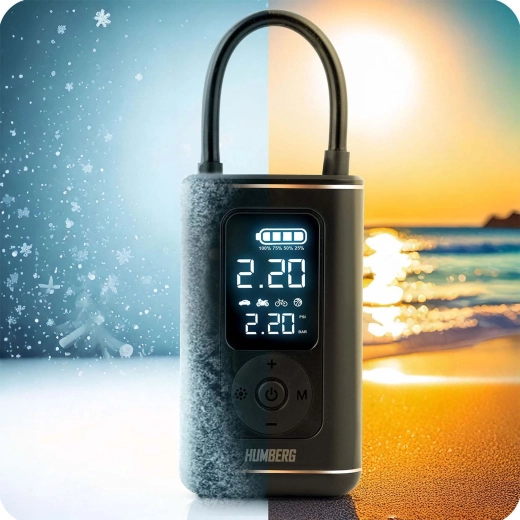 Kompakt og kraftfuld trådløs mini-pumpe fra HUMBERG med 2500 mAh batterikapacitet pumper hurtigt bildæk, motorcykel- og cykeldæk samt sportsbolde. Takket være digitalt display, forudindstillede tilstande og automatisk stop ved måletryk er betjeningen nem og sikker. Der er også LED-lygte med SOS til nattelog nødsituationer og opladning via USB‑C.