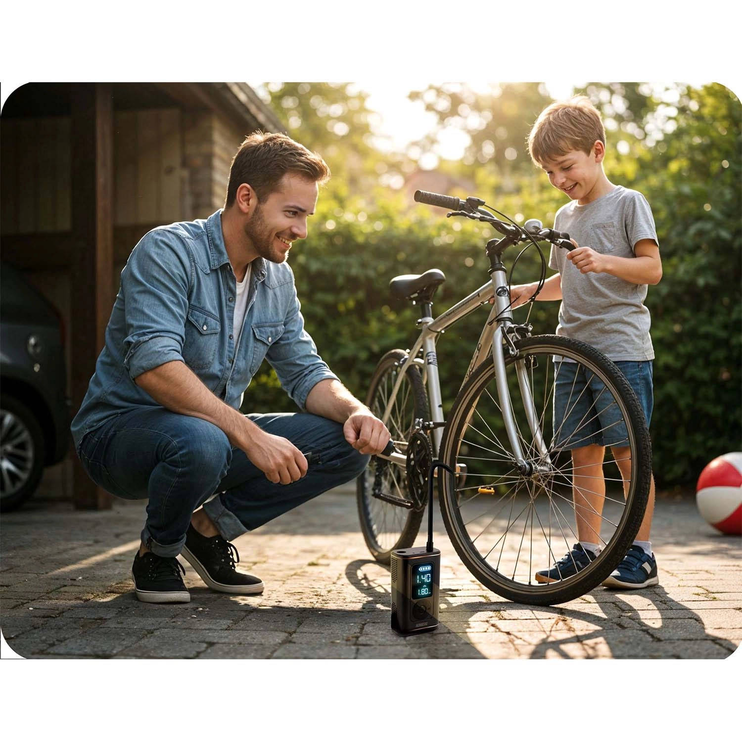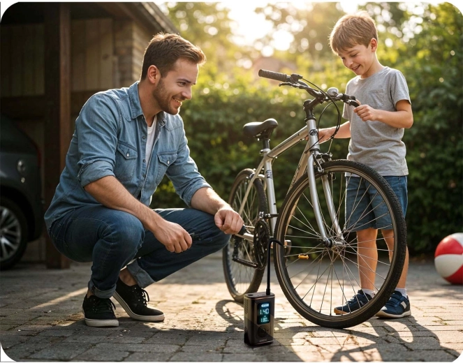 Vælg en forudindstillet profil til bil, motorcykel, cykel eller bolde, eller gem din egen. Når måltrykket er nået, slukker kompressoren automatisk – sikkert og uden overvågning.