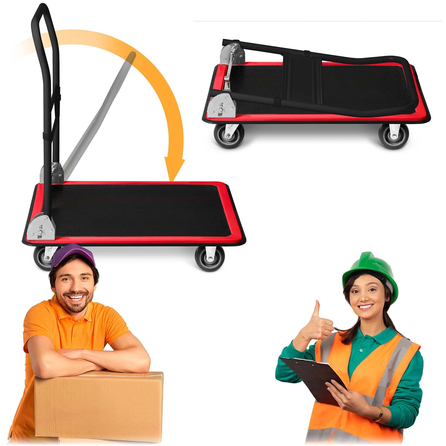 Det praktiske sammenklappelige håndtag sparer markant plads ved opbevaring og gør vognen hurtigt klar til brug. Den egner sig til lagre, logistikcentre, butiksarealer, catering og også til hjemmebrug ved flytning eller i værkstedet.
