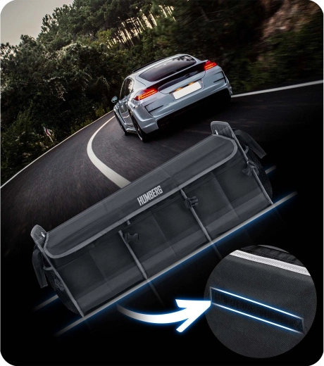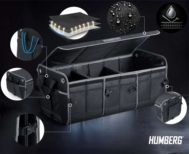 Forvandl kaos til overblik. HUMBERG-organizeren til bagagerummet er designet til både bilister, bude og familier – den holder indkøb, værktøj, kabler og førstehjælp sikkert opbevaret og let tilgængeligt. Den sammenklappelige konstruktion gør det muligt at bruge fra ét til flere rum, de stive vægge holder formen, og det aftagelige låg beskytter indholdet mod støv og nysgerrige blikke.