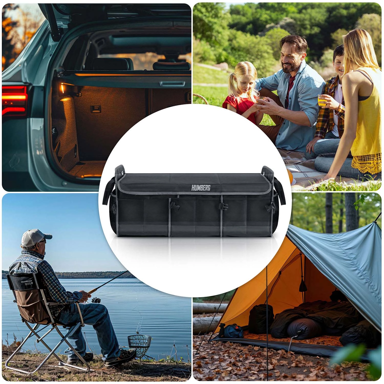 Få styr på bilen én gang for alle. Denne sammenklappelige bagagerumsorganizer fra HUMBERG tilbyder stive vægge, aftageligt låg, vandafvisende materiale og modulært indre med flytbare skillevægge. Takket være skridsikre velcobånd, fastgørelsesstropper og praktiske lommer bliver alting på sin plads – fra indkøb og værktøj til rejseudstyr.