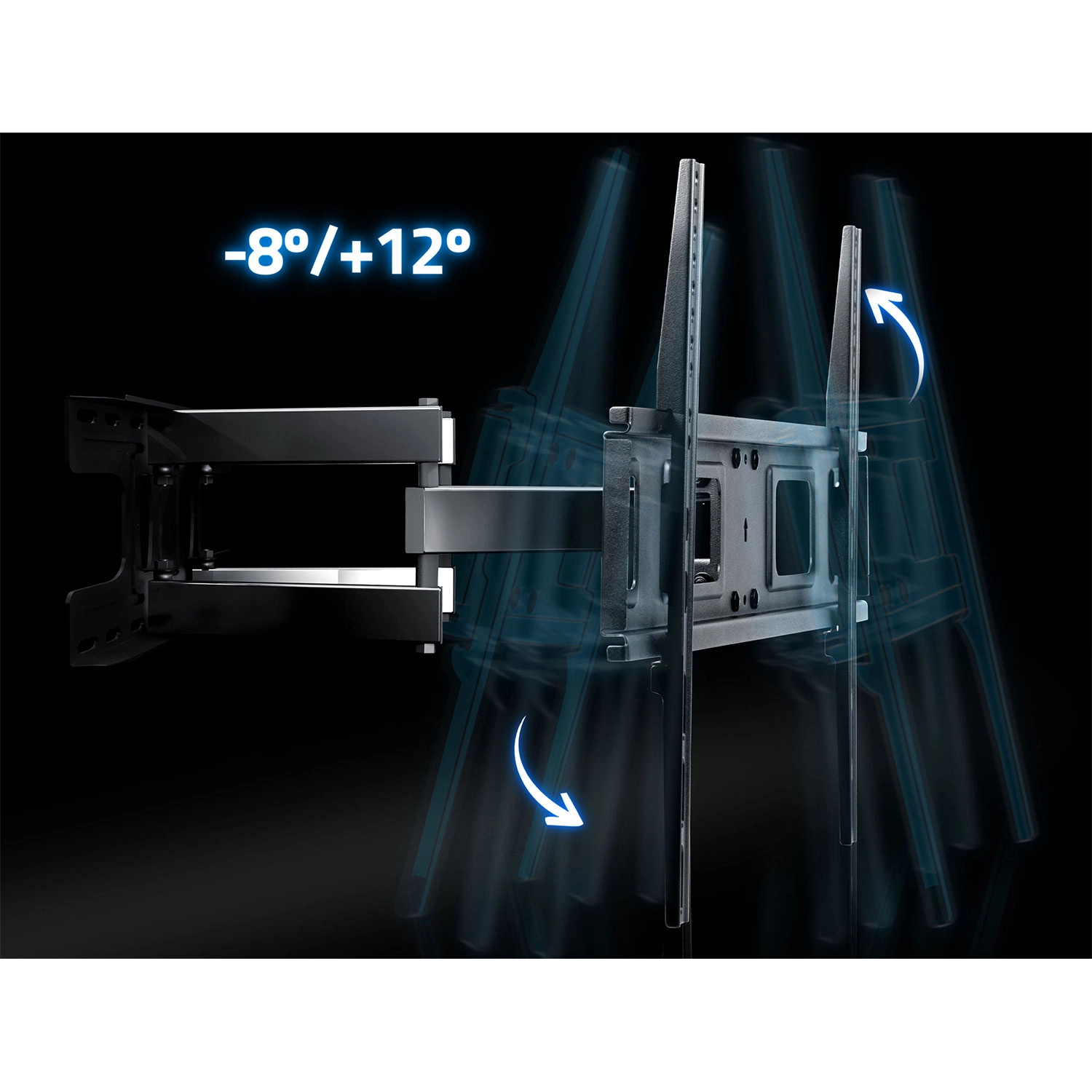 Takket være det brede bevægeområde får du behagelig visning fra enhver plads i rummet. Tilt -8° til 12° hjælper med at reducere genskær, drejning op til 120° muliggør præcis orientering af skærmen, og systemet til niveaukorrektion på ±3° gør det nemt at få perfekt nivellering selv efter ophængning. Beslaget er kompatibelt med VESA fra 50×50 til 600×400 mm, så det passer til de fleste moderne TV.