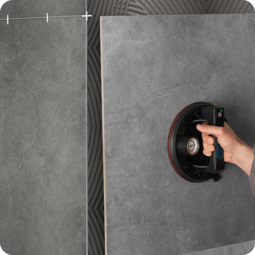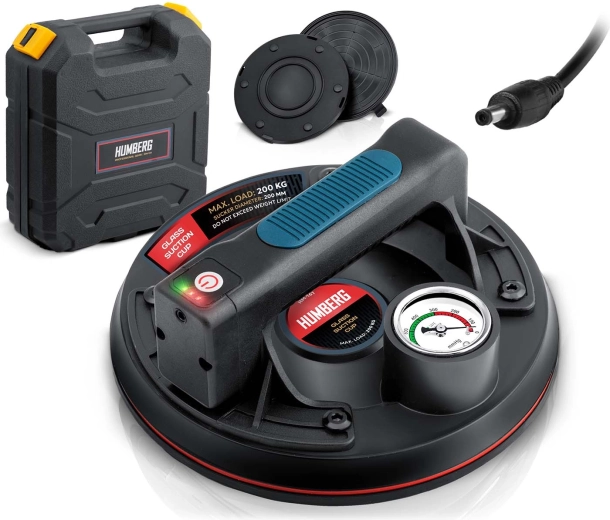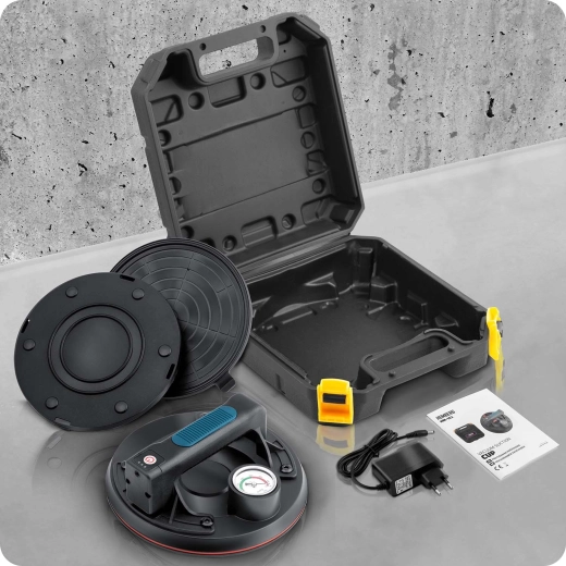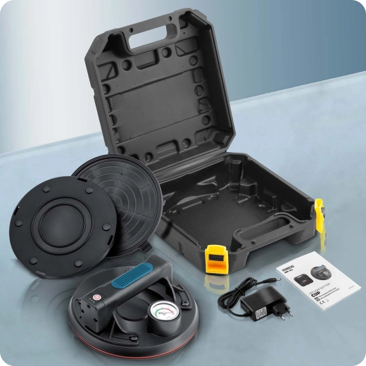 Det indbyggede Li-ion-batteri på 2400 mAh giver op til 8 timers uafbrudt drift, og fuld opladning tager kun 2 timer. Sugekoppen leveres i en praktisk kuffert med alt nødvendigt tilbehør til professionel brug ved montage og materialehåndtering.