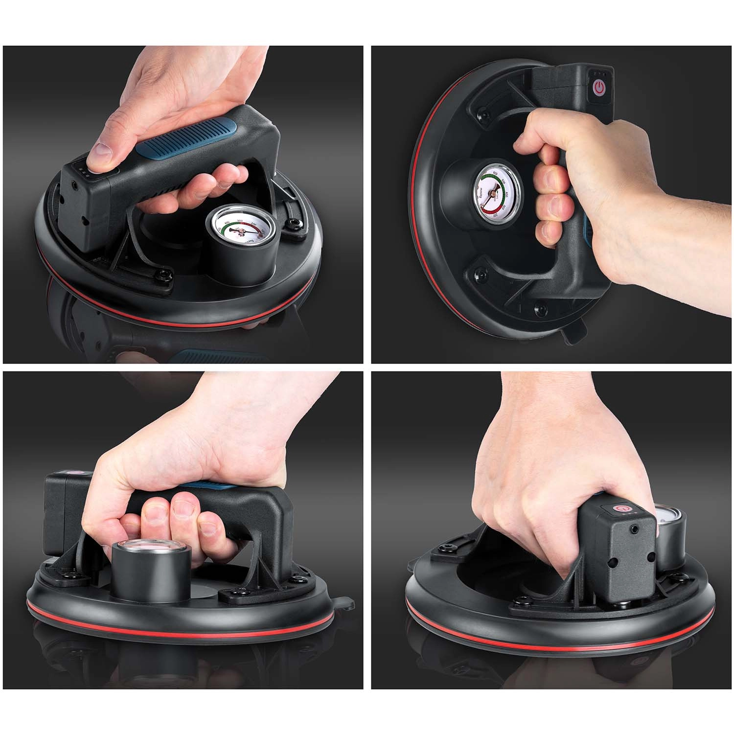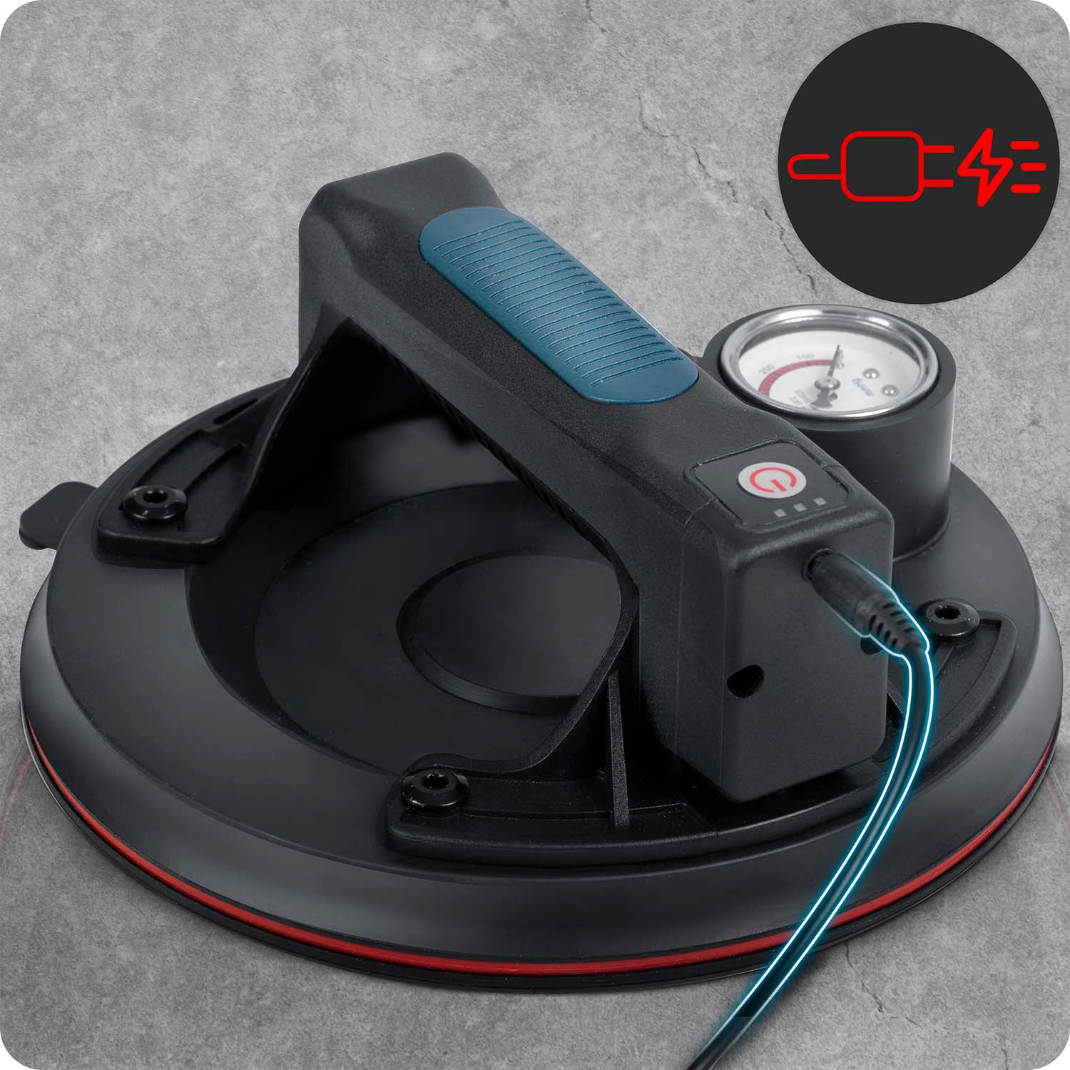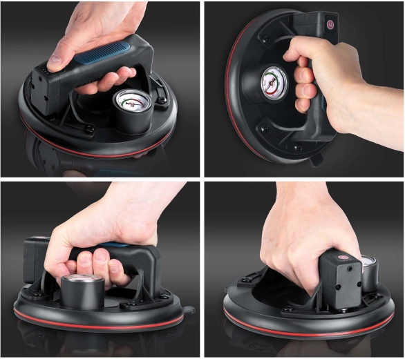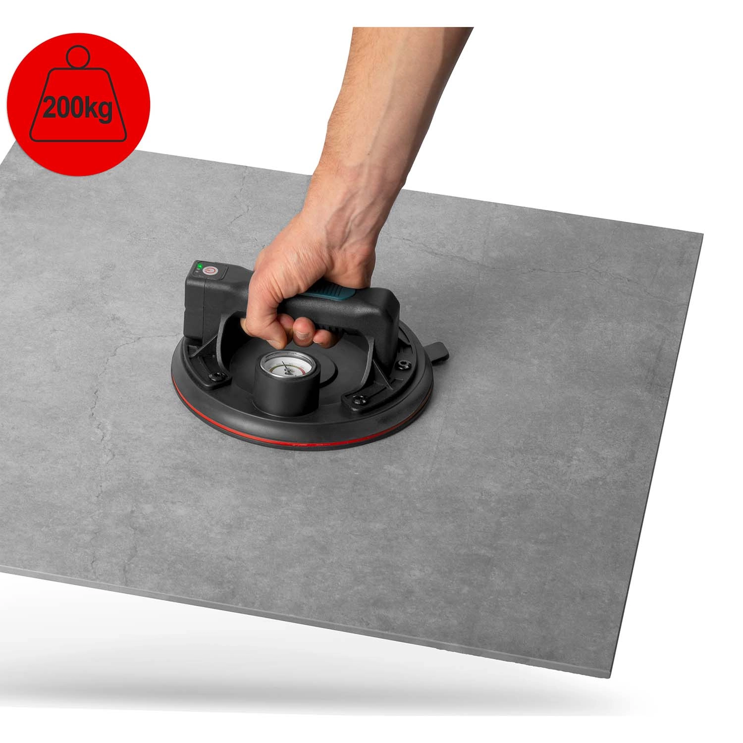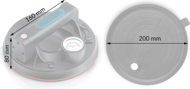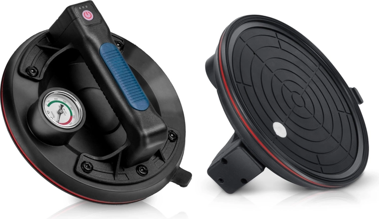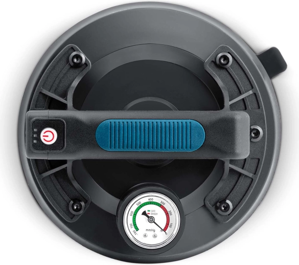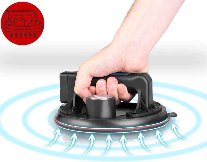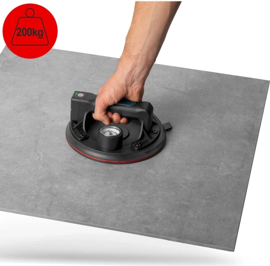 Denne kompakte elektriske sugekop er designet til hurtig og sikker håndtering af tunge paneler, glas, fliser eller poleret sten. Den tredobbelte gummitætningsmanchet sikrer fremragende vedhæftning, tæthed og vibrationsdæmpning, mens manometeret med farveskala giver løbende kontrol over undertryksniveauet (optimalt 300–760 mmHg). Et ergonomisk håndtag med formet greb øger komforten selv ved længerevarende arbejde.