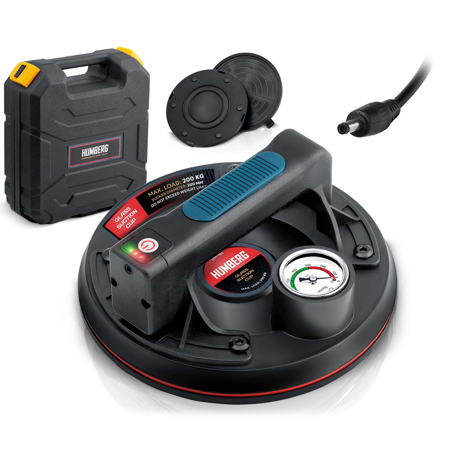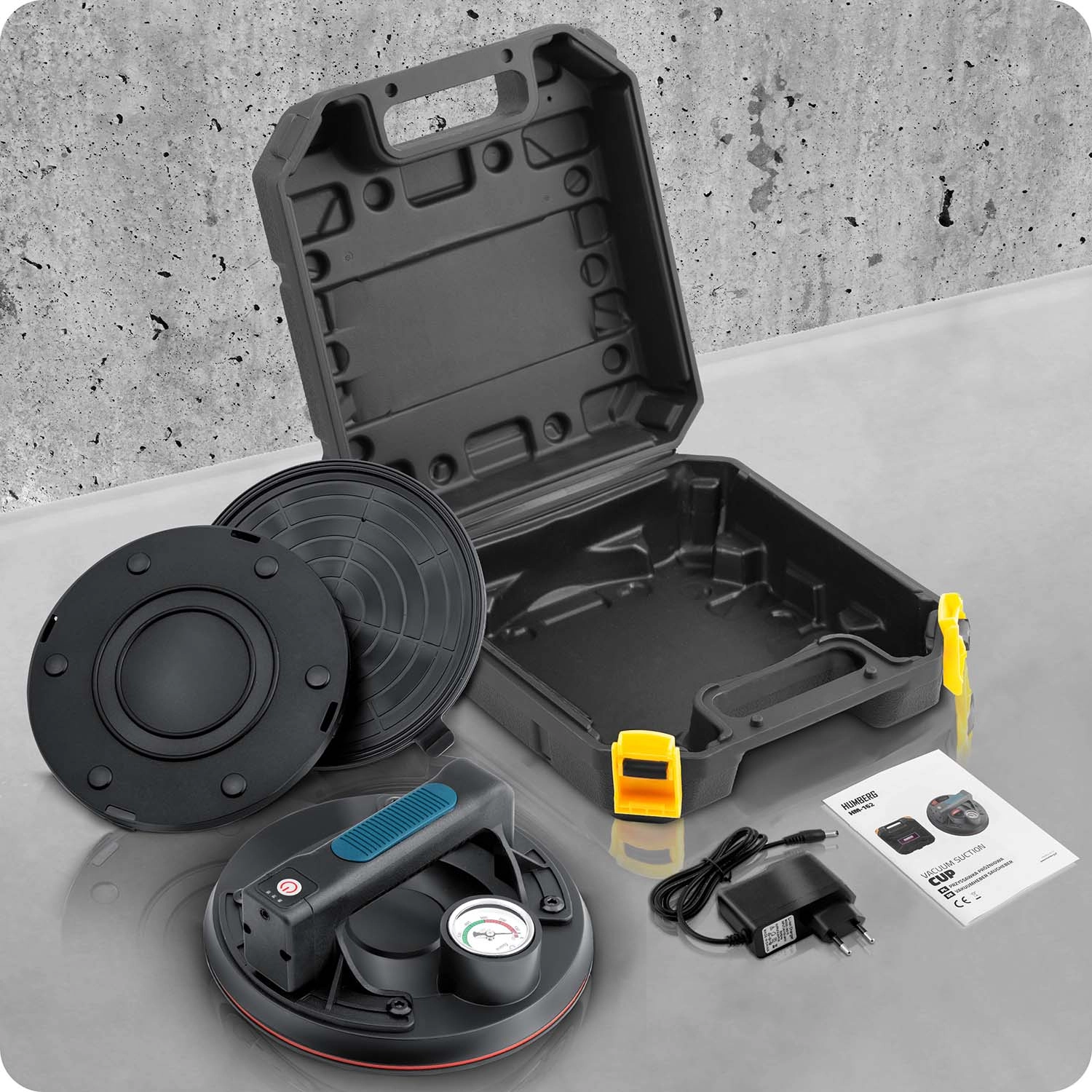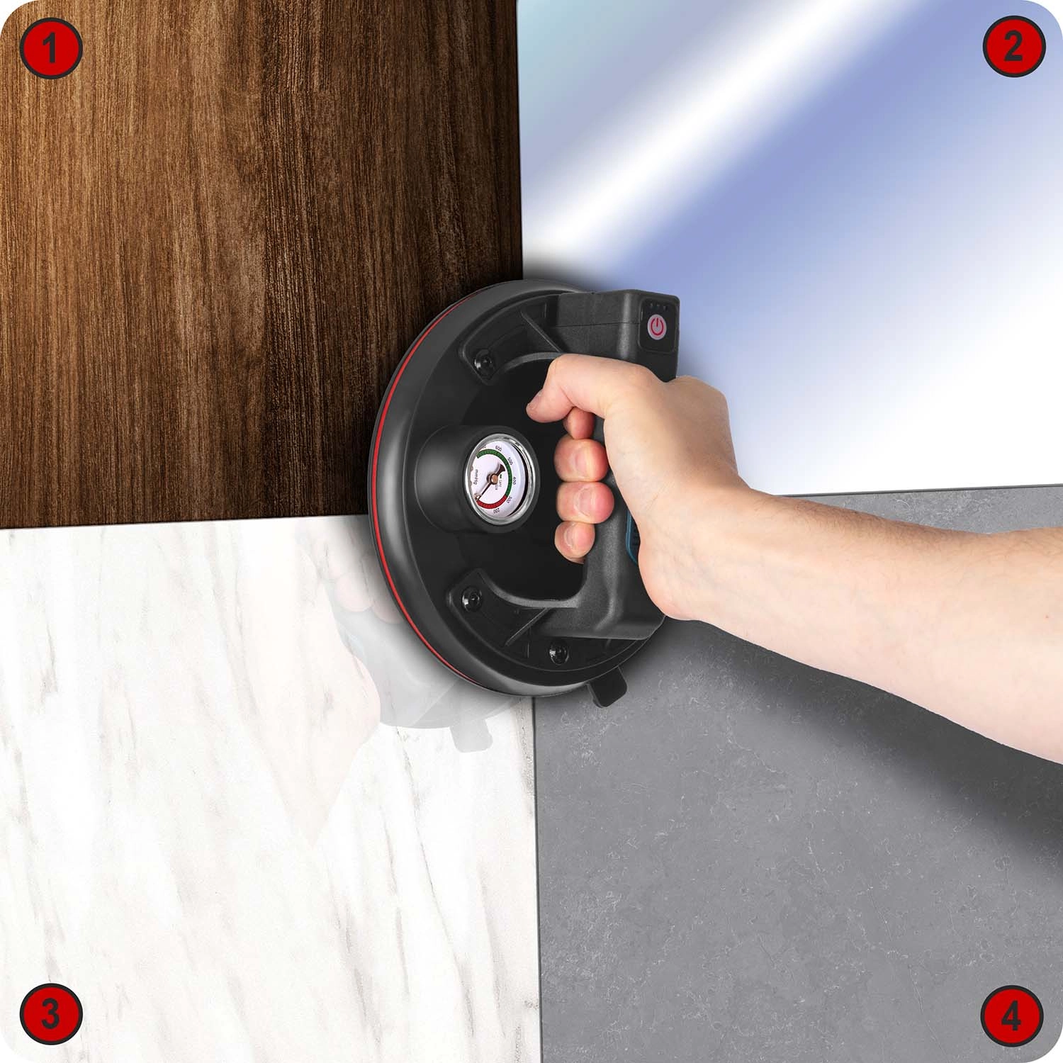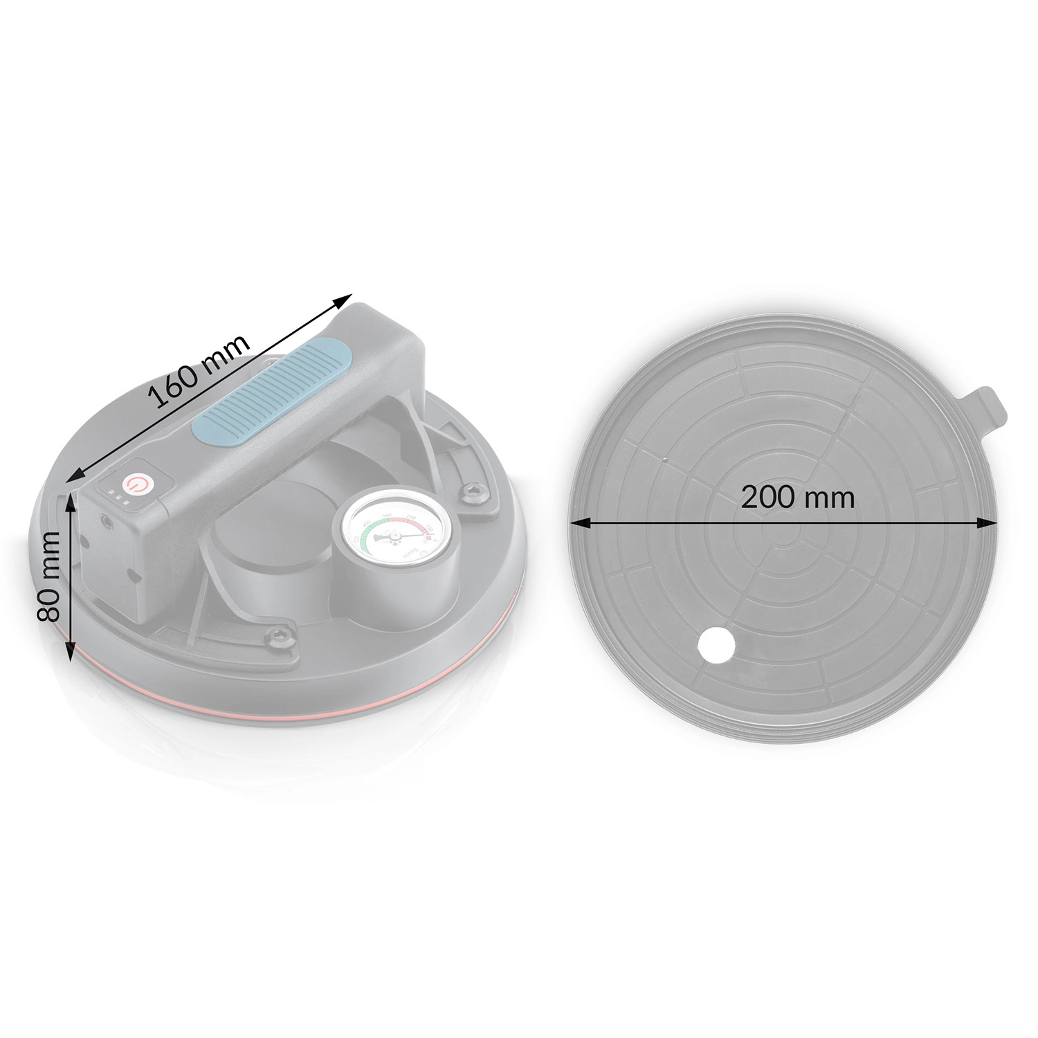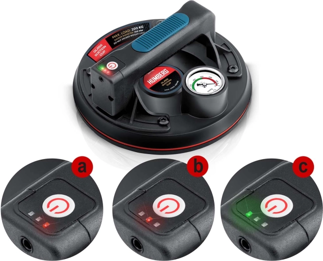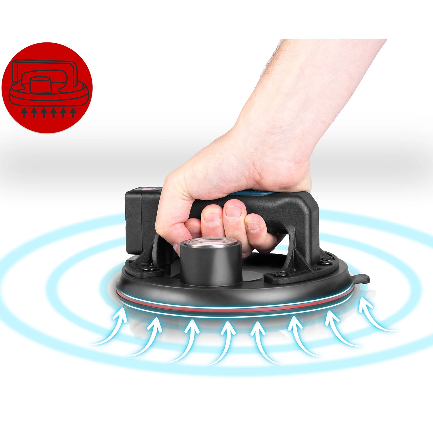 Denne kompakte elektriske sugekop er designet til hurtig og sikker håndtering af tunge paneler, glas, fliser eller poleret sten. Den tredobbelte gummitætningsmanchet sikrer fremragende vedhæftning, tæthed og vibrationsdæmpning, mens manometeret med farveskala giver løbende kontrol over undertryksniveauet (optimalt 300–760 mmHg). Et ergonomisk håndtag med formet greb øger komforten selv ved længerevarende arbejde.