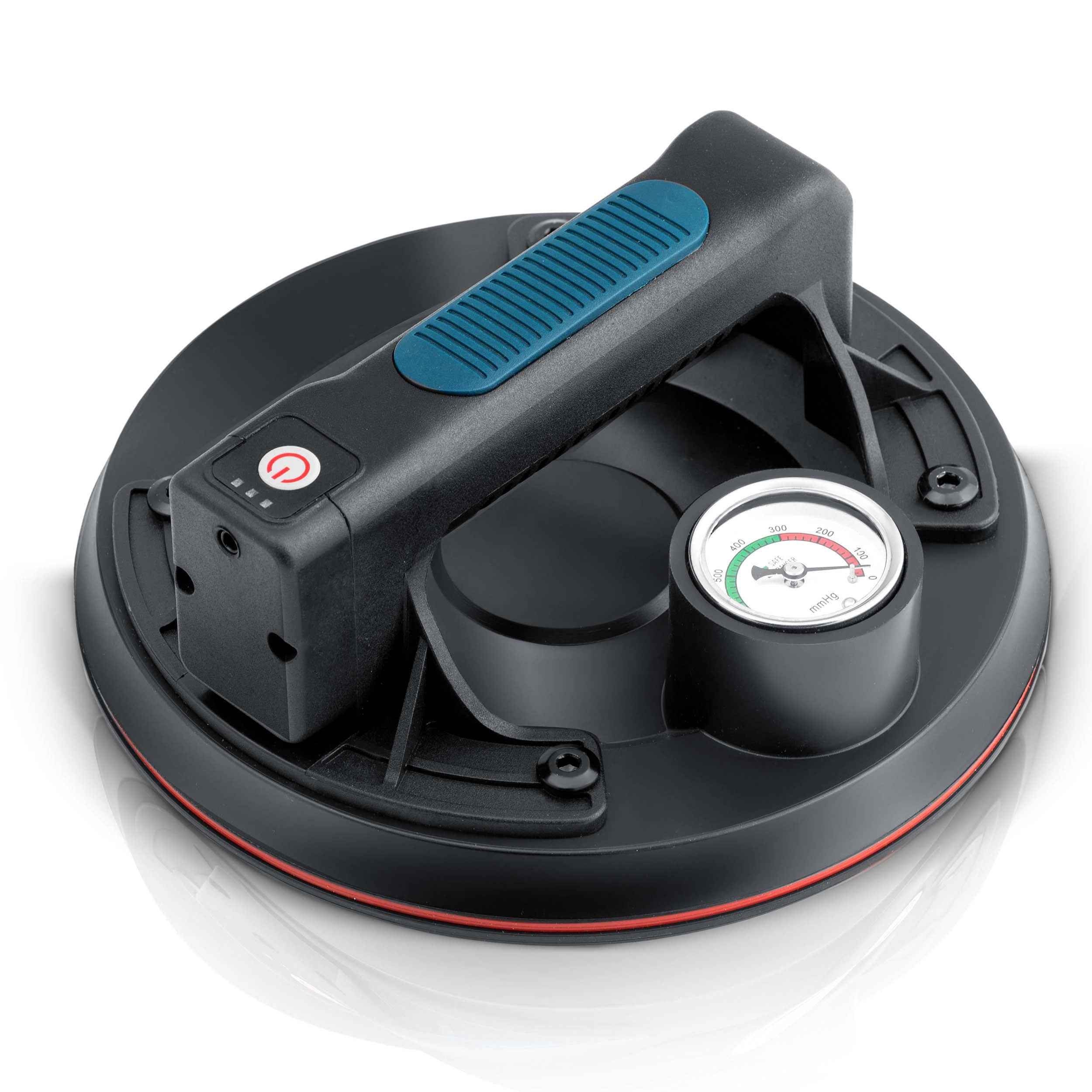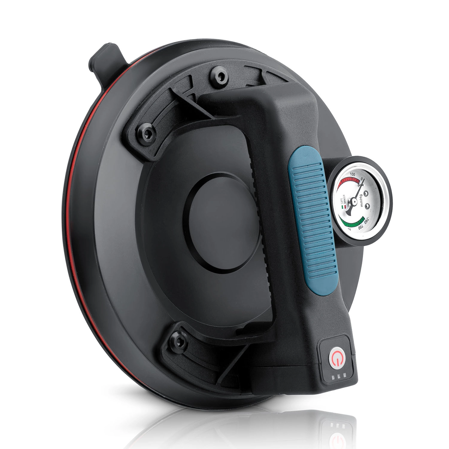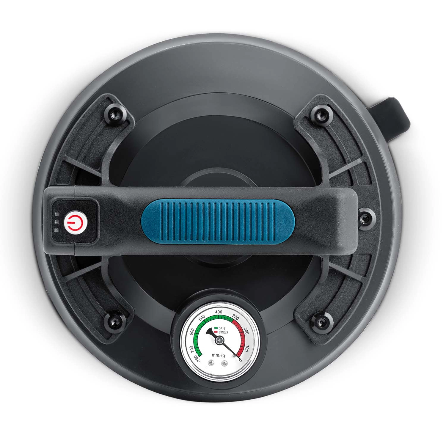 Manometeret med farveskala viser tydeligt niveauet af undertryk: 0–300 mmHg (lavt, farligt) og 300–760 mmHg (optimalt, sikkert). Sugeskiven genopbygger desuden automatisk undertrykket ved fald.