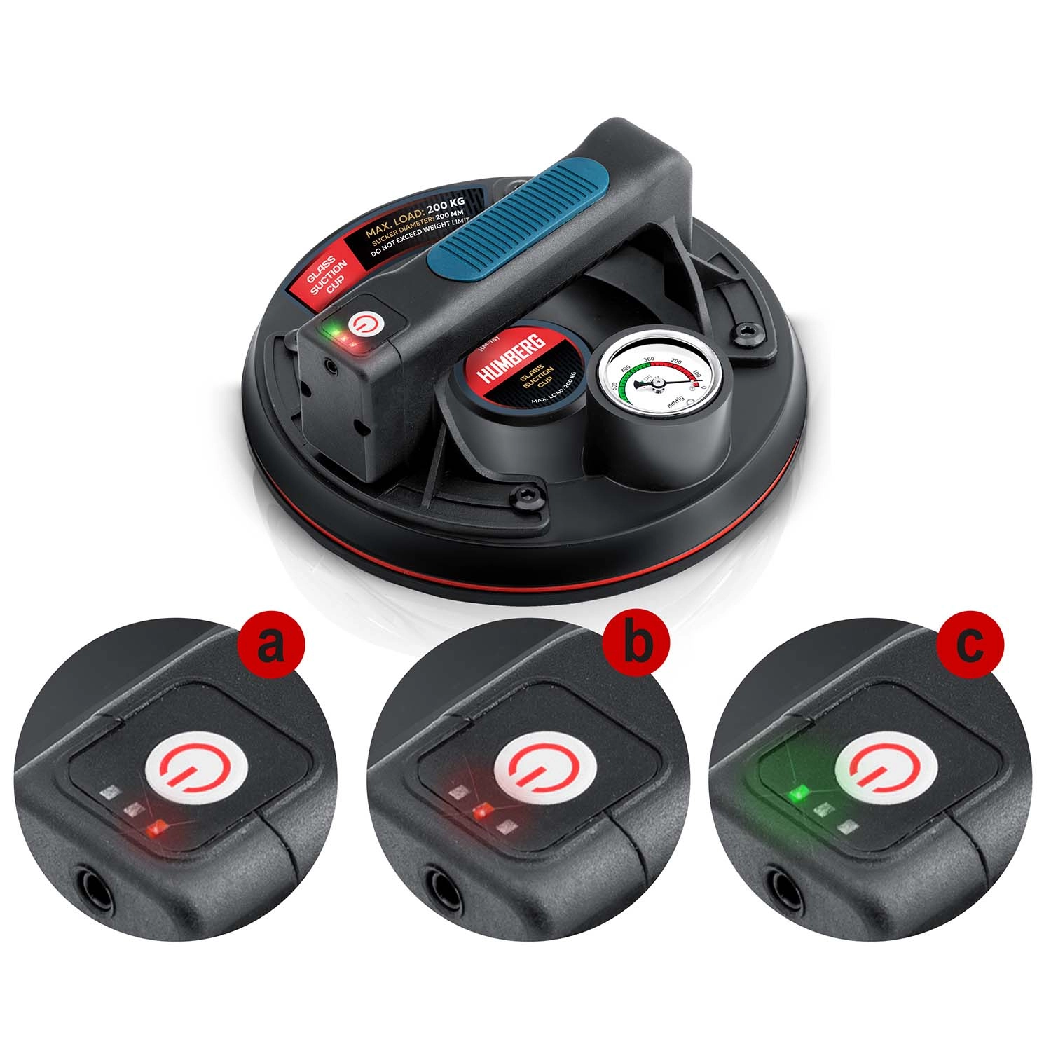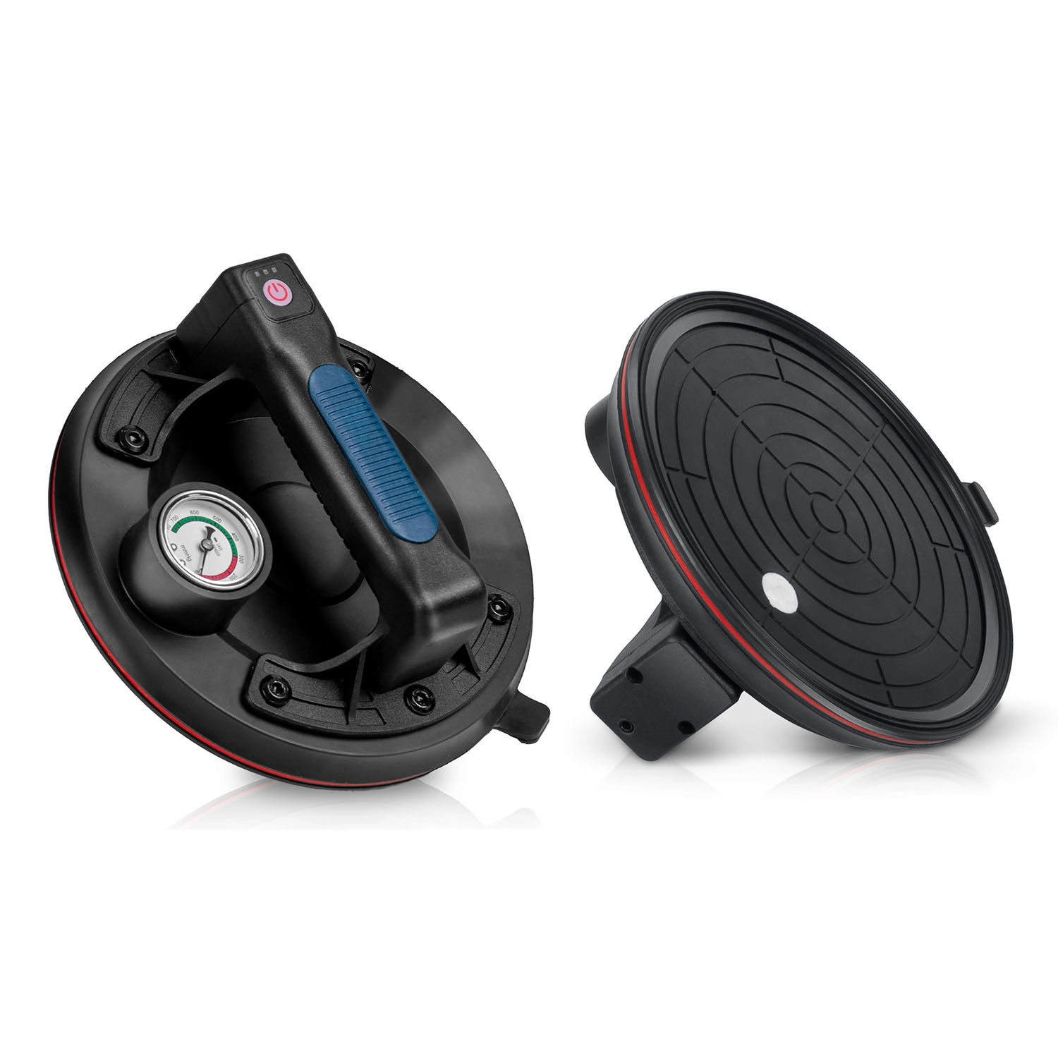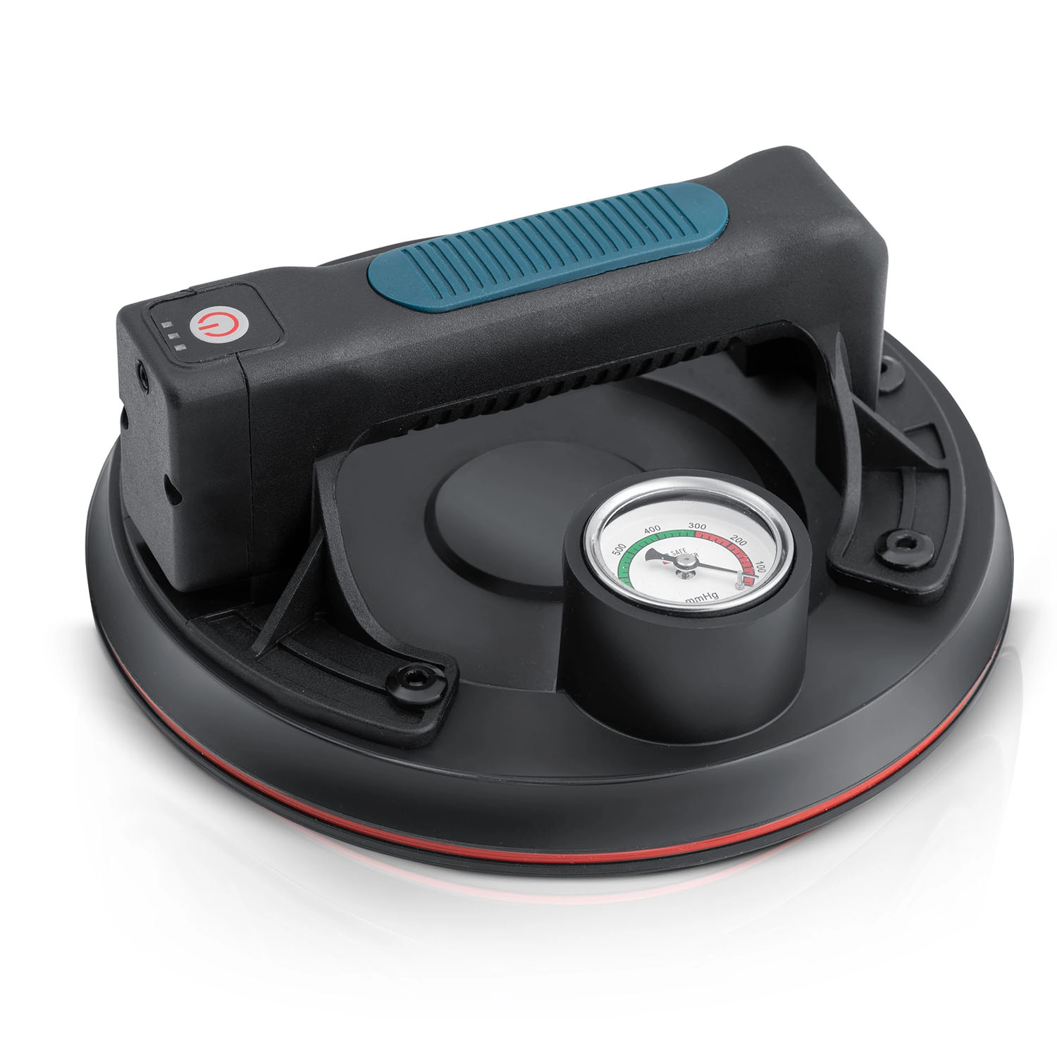 Manometeret med farveskala viser tydeligt niveauet af undertryk: 0–300 mmHg (lavt, farligt) og 300–760 mmHg (optimalt, sikkert). Sugeskiven genopbygger desuden automatisk undertrykket ved fald.