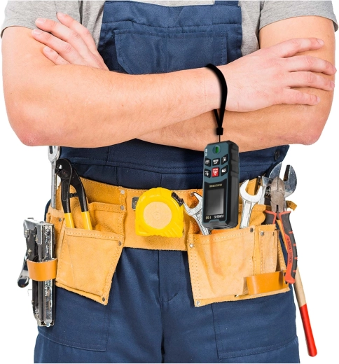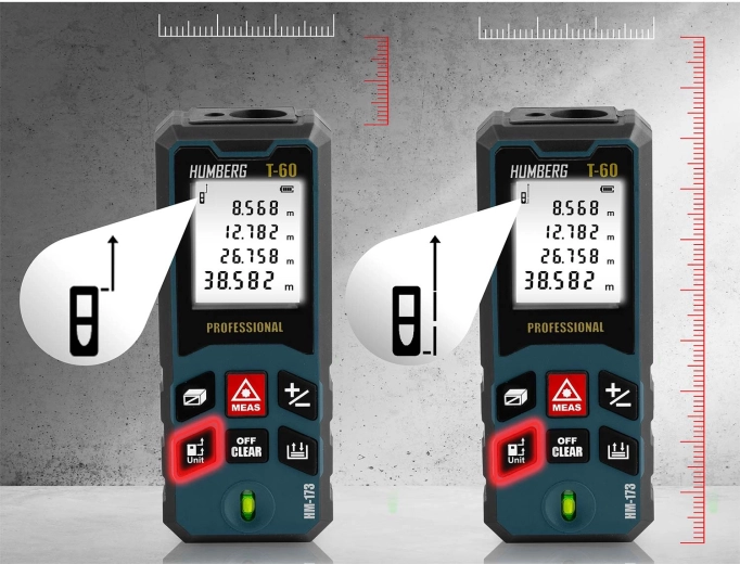 Laserafstandsmåleren HUMBERG T-60 måler i området 0,05–60 m (maks. 65 m) med en nøjagtighed på ±1,5 mm. Den store, overskuelige skærm gør hurtige aflæsninger nemme, selv i dårligere lys.
