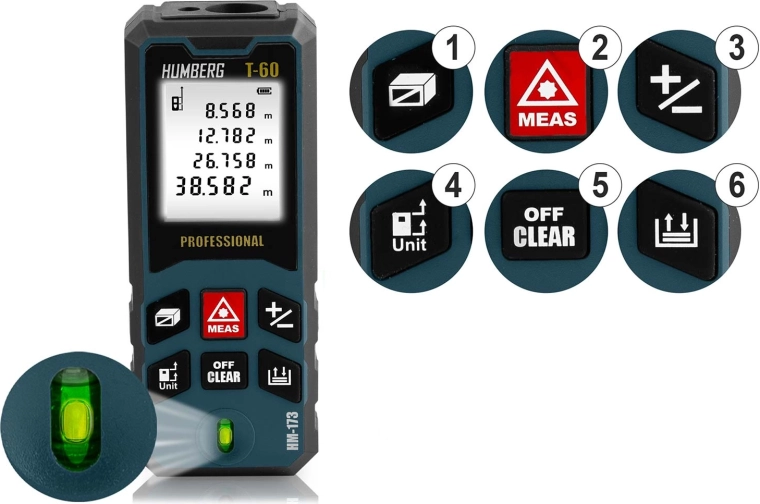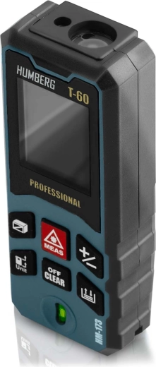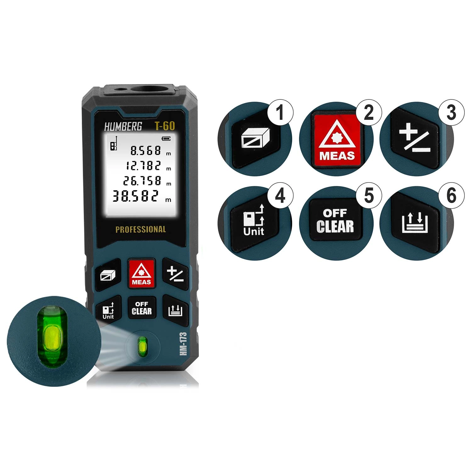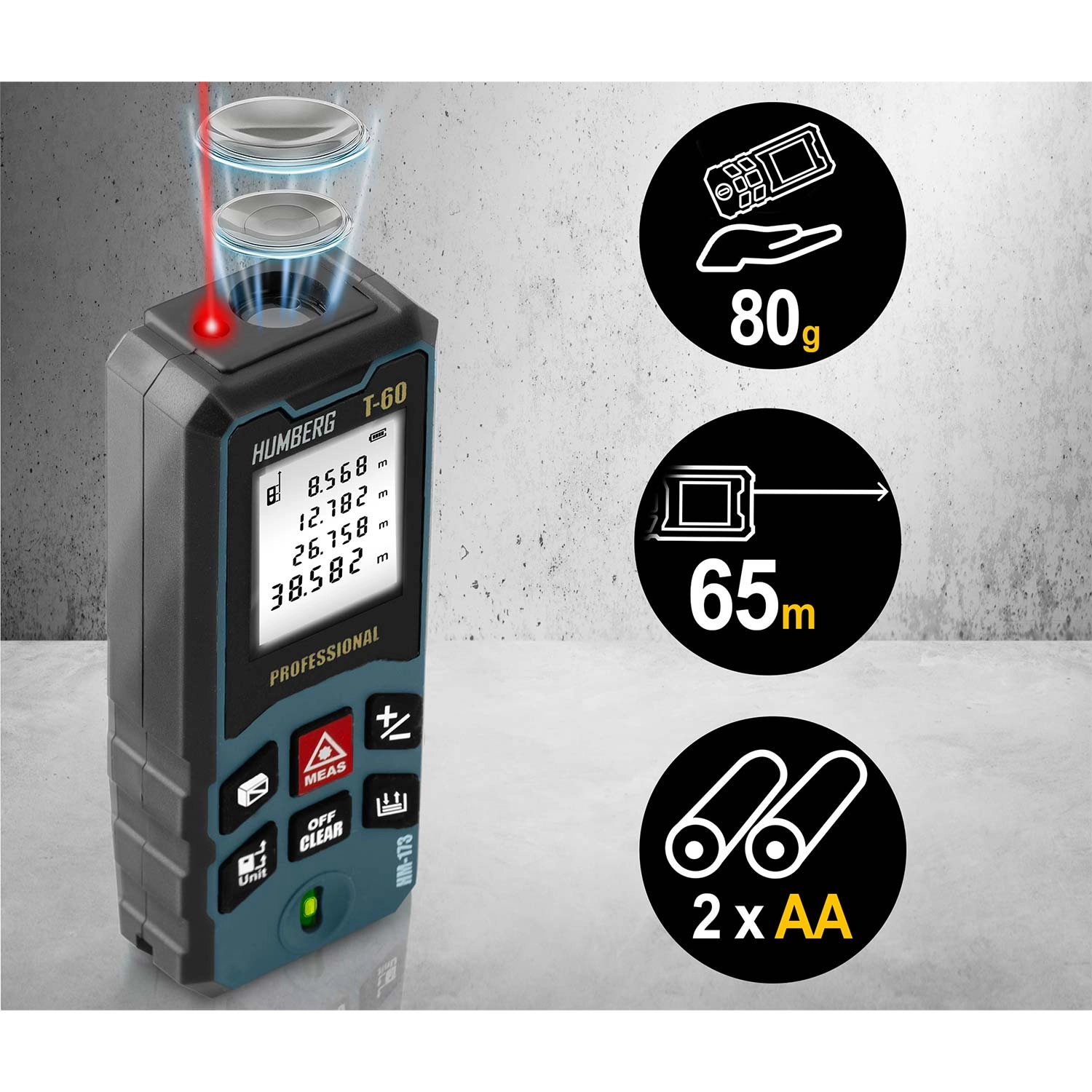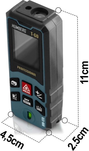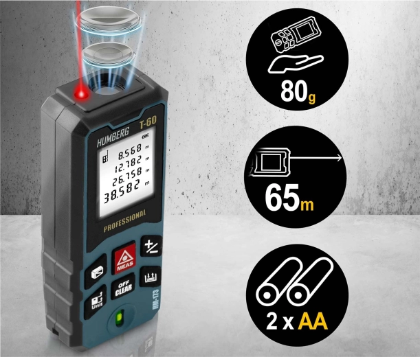 Den professionelle laserafstandsmåler HUMBERG T-60 kombinerer pålidelighed, enkel betjening og kompakte mål. Den måler afstande i området 0,05–60 m (maks. 65 m) med en nøjagtighed på ±1,5 mm og beregner straks areal, volumen samt indirekte højde via Pythagoras-metoden. Den store skærm sikrer nem aflæsning af værdier både indendørs og udendørs.