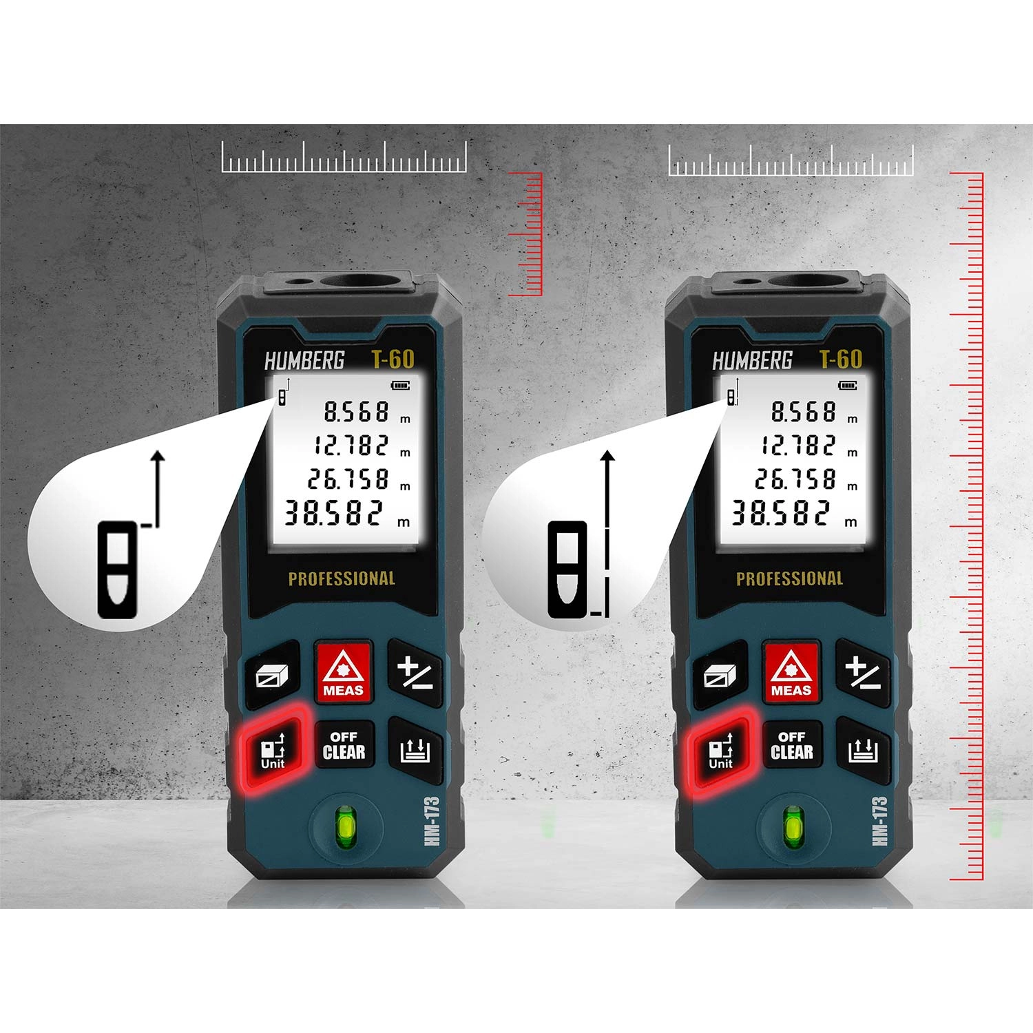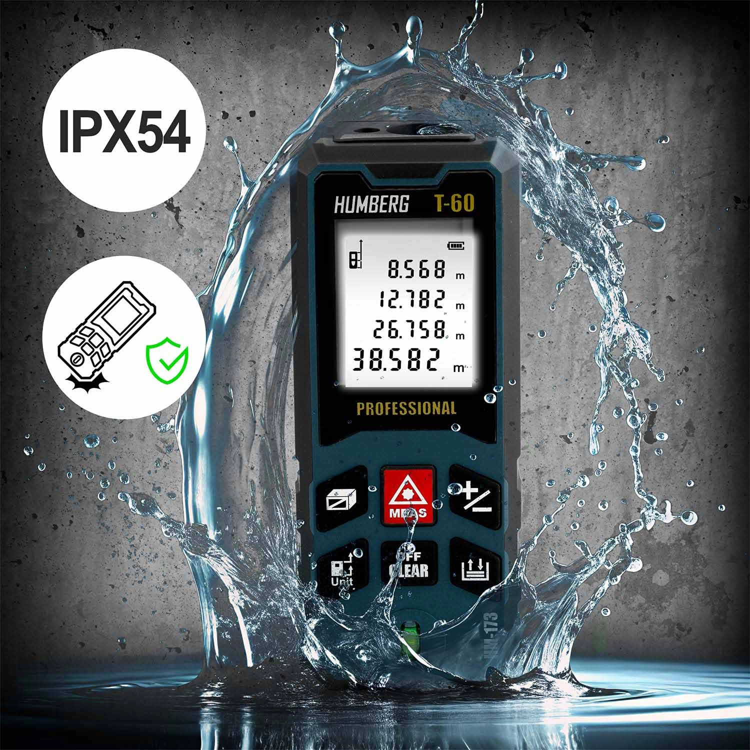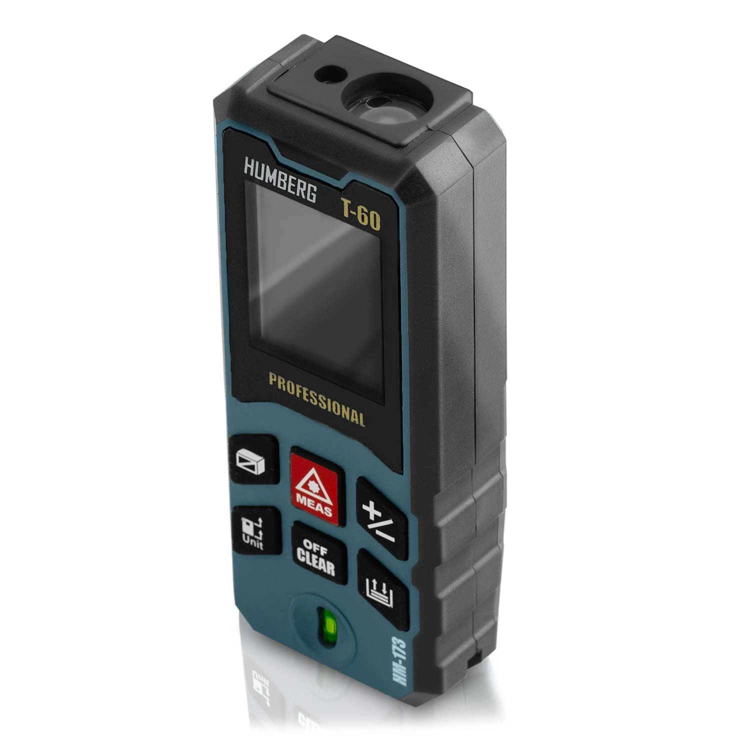 Den professionelle laserafstandsmåler HUMBERG T-60 kombinerer pålidelighed, enkel betjening og kompakte mål. Den måler afstande i området 0,05–60 m (maks. 65 m) med en nøjagtighed på ±1,5 mm og beregner straks areal, volumen samt indirekte højde via Pythagoras-metoden. Den store skærm sikrer nem aflæsning af værdier både indendørs og udendørs.