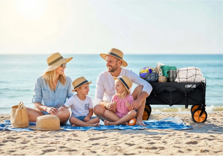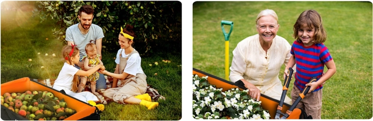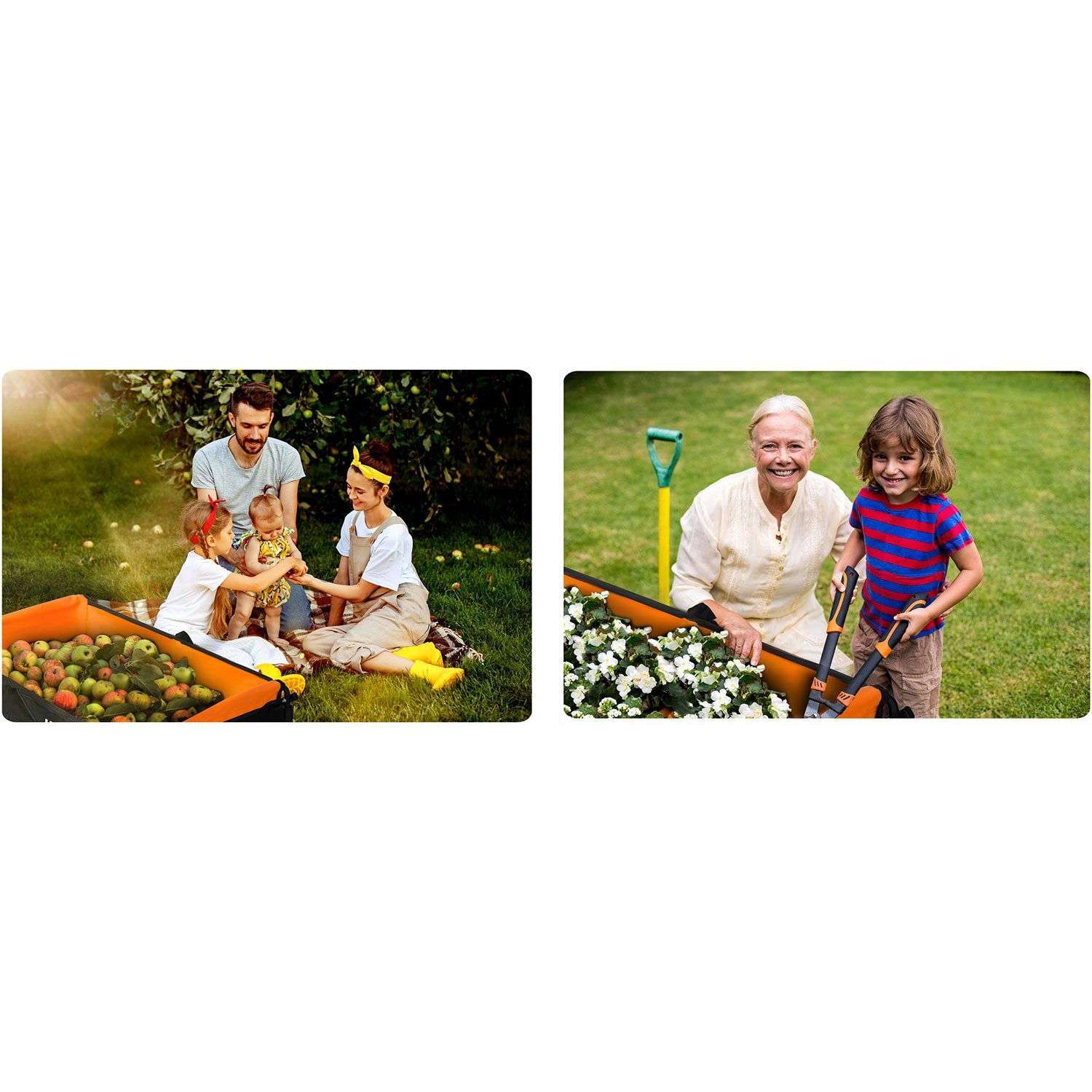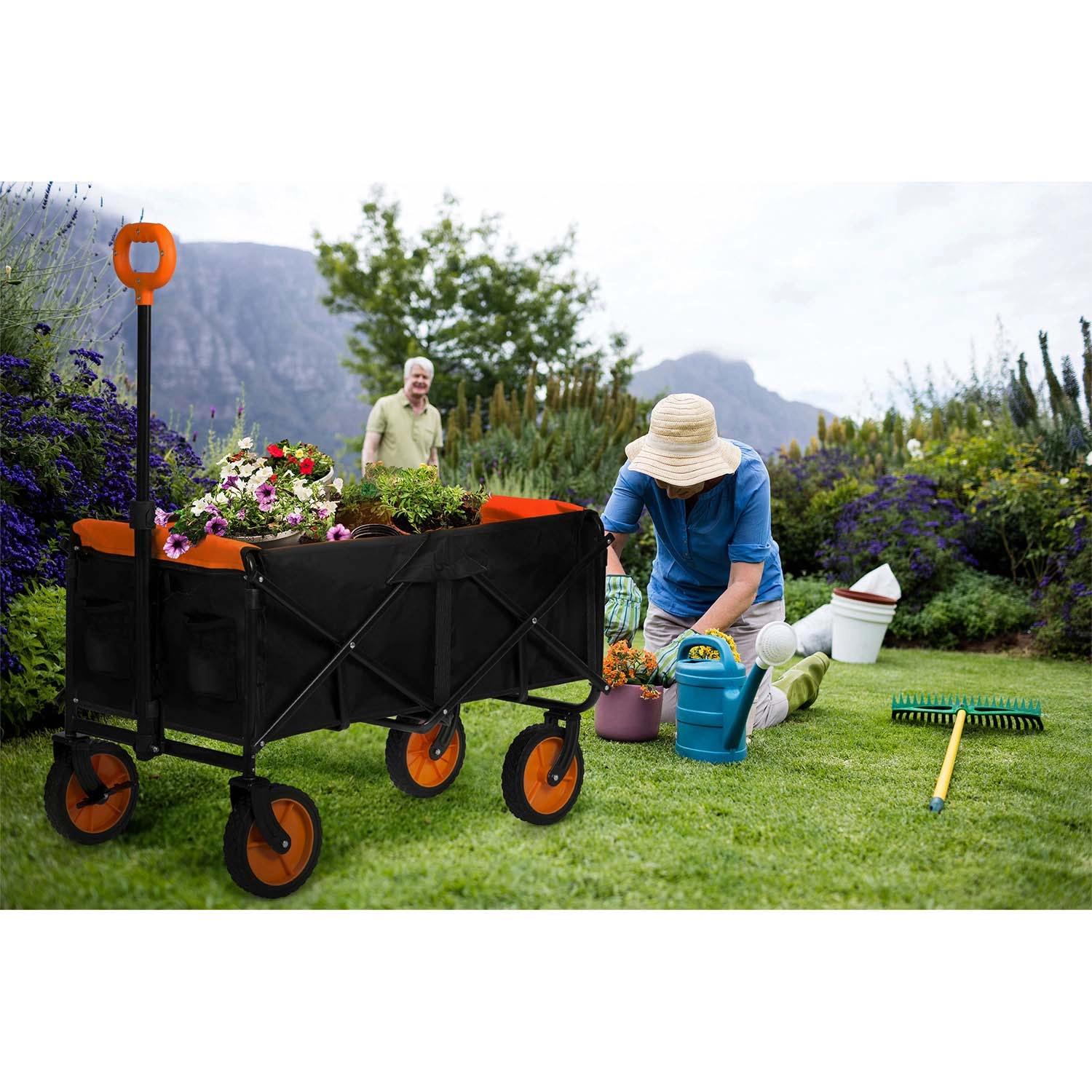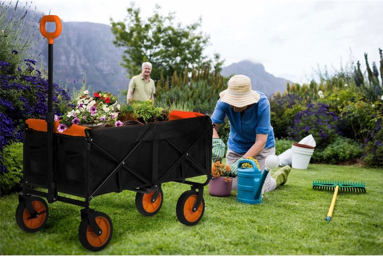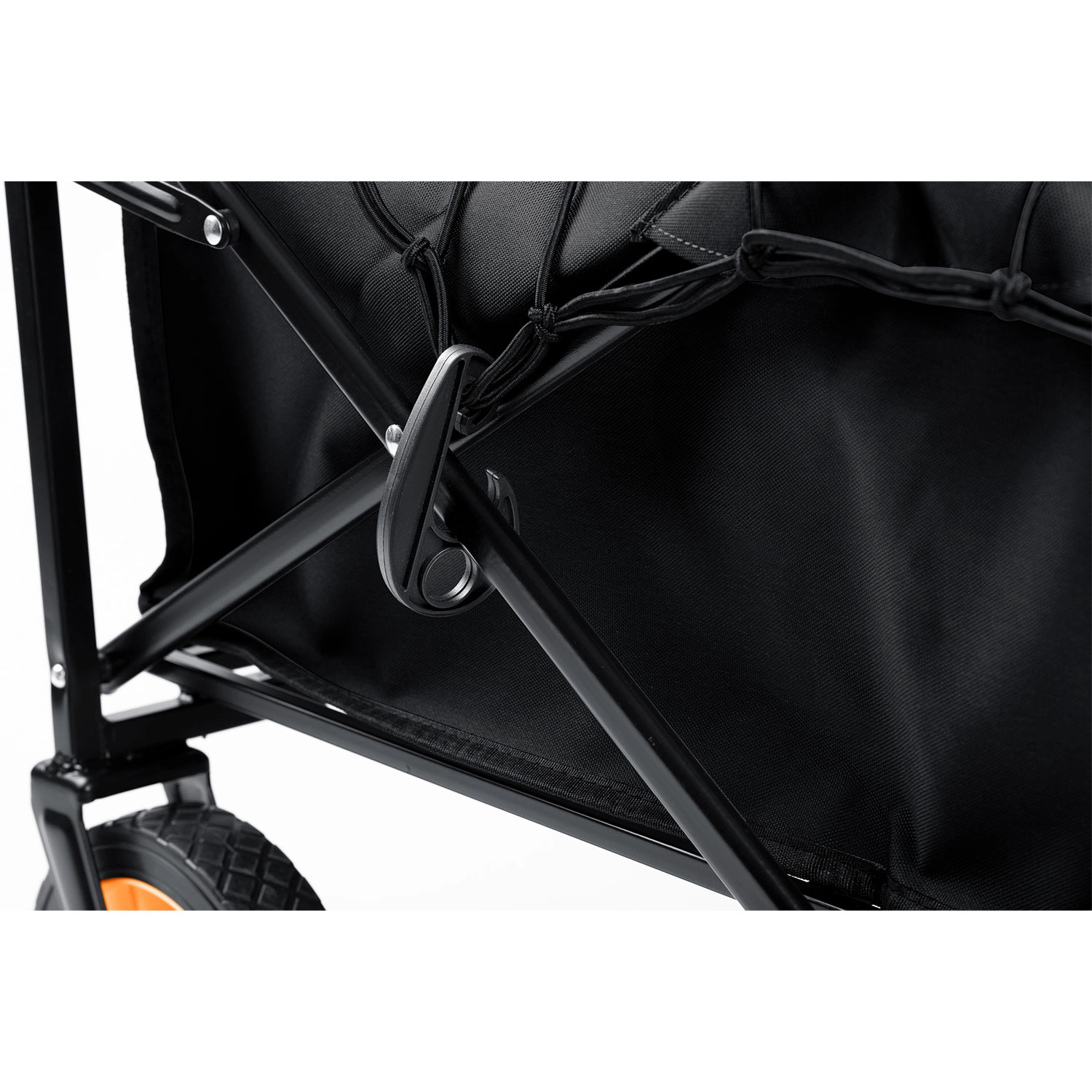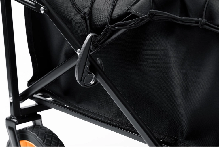 Forreste drejehjul gør manøvreringen let selv med fuld last, mens det ergonomiske teleskophåndtag øger komforten ved træk. To praktiske kopholdere holder termokande, flaske eller dåser lige ved hånden. Som bonus får du et sikkerhedsnet med kroge, der holder lasten på plads under kørsel over ujævnheder.