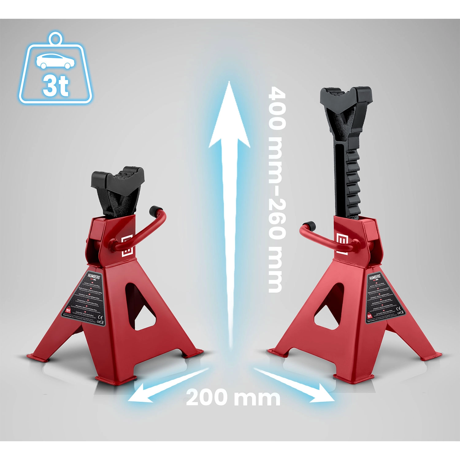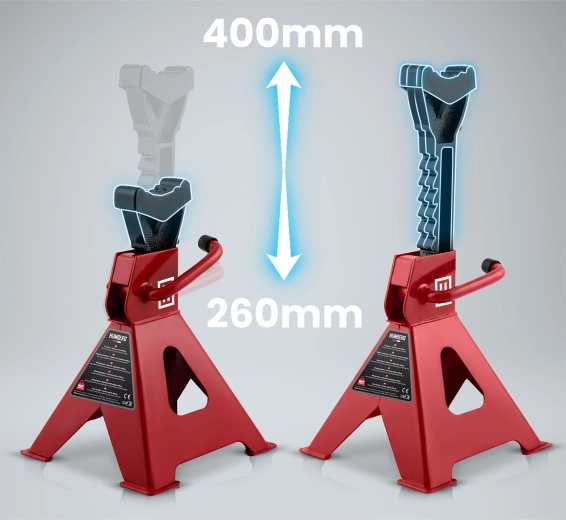 Robust sæt med to bilstøttebukke med bæreevne op til 3 ton til sikker fastgørelse af køretøjet under vedligeholdelse. Takket være skraldemekanismen justerer du nemt højden i området 260–400 mm. Beskyttende gummiindsatser beskytter undervognen mod skader, og den stabile stålkonstruktion med bred base sikrer tryghed selv ved maksimal belastning.
