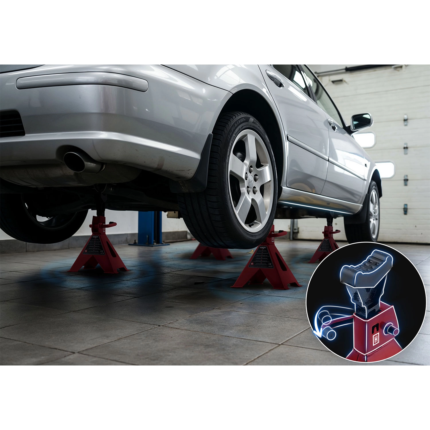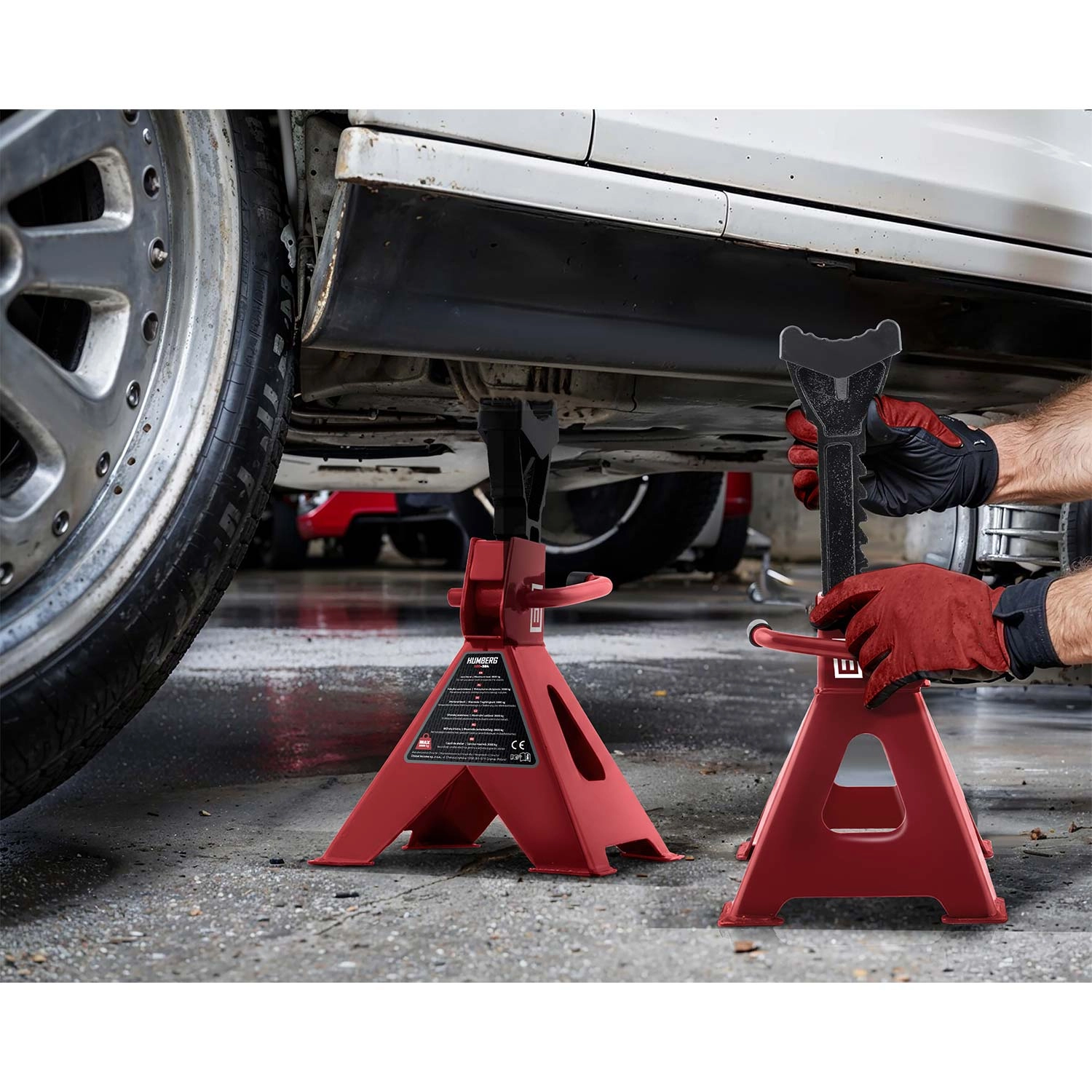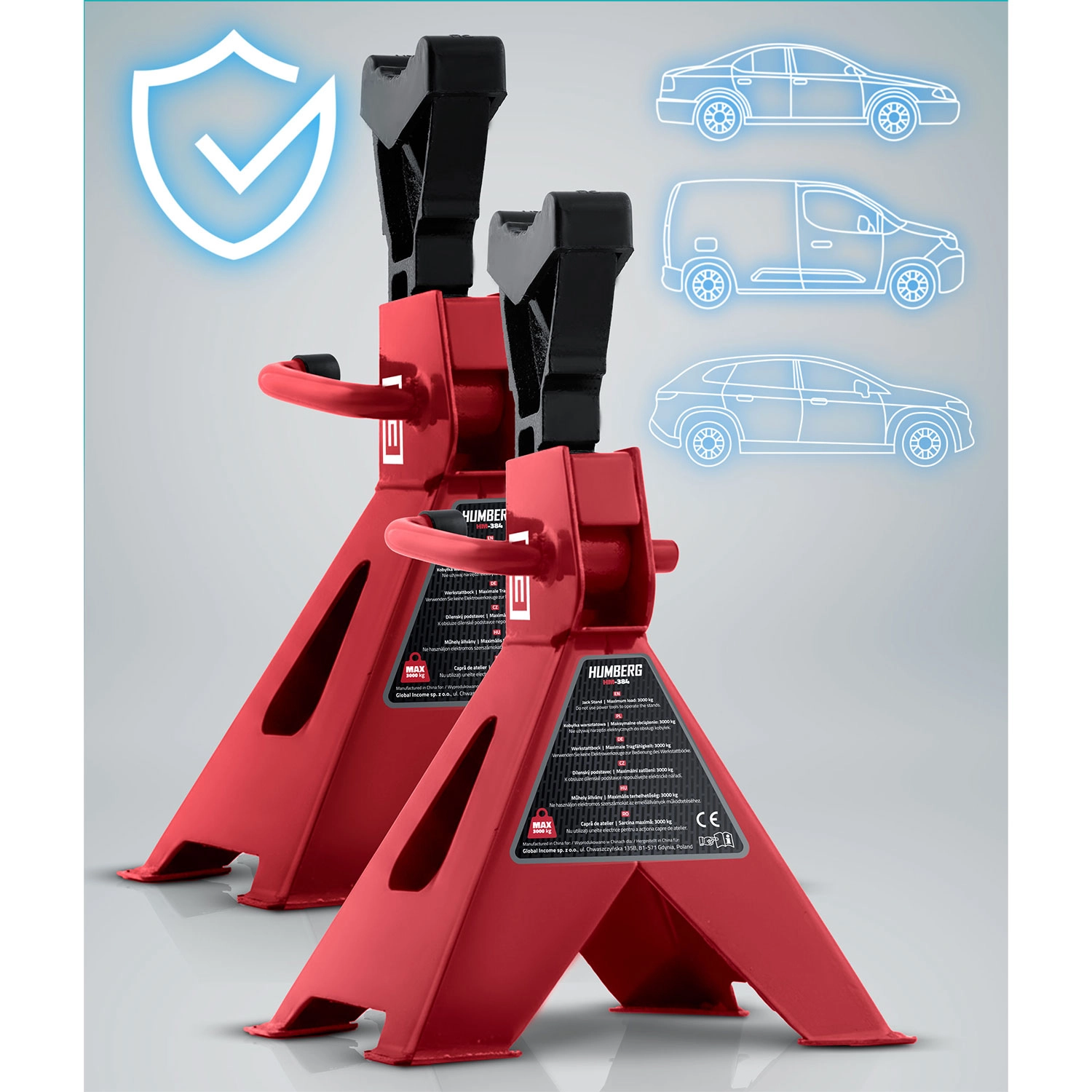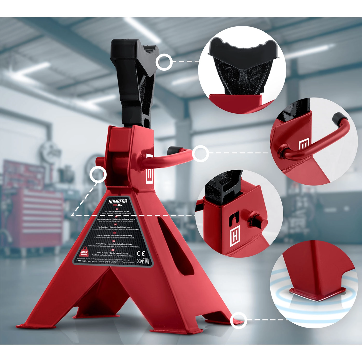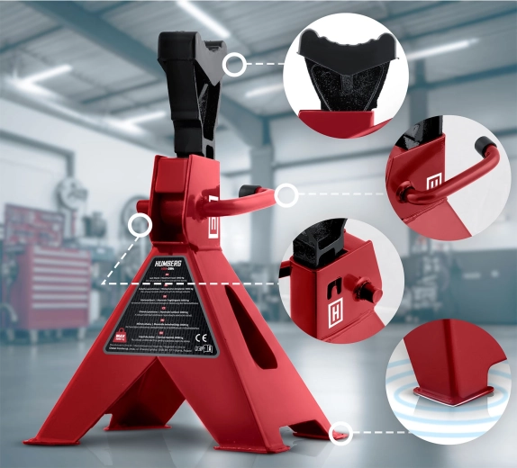 Pålidelige og holdbare støttebukke til bil, ideelle til både hjemmegaragen og det professionelle værksted. Skraldebaseret højdejustering giver hurtig og sikker positionering, mens gummiindsatserne minimerer risikoen for ridser eller trykmærker på karrosseriets støttepunkter.
