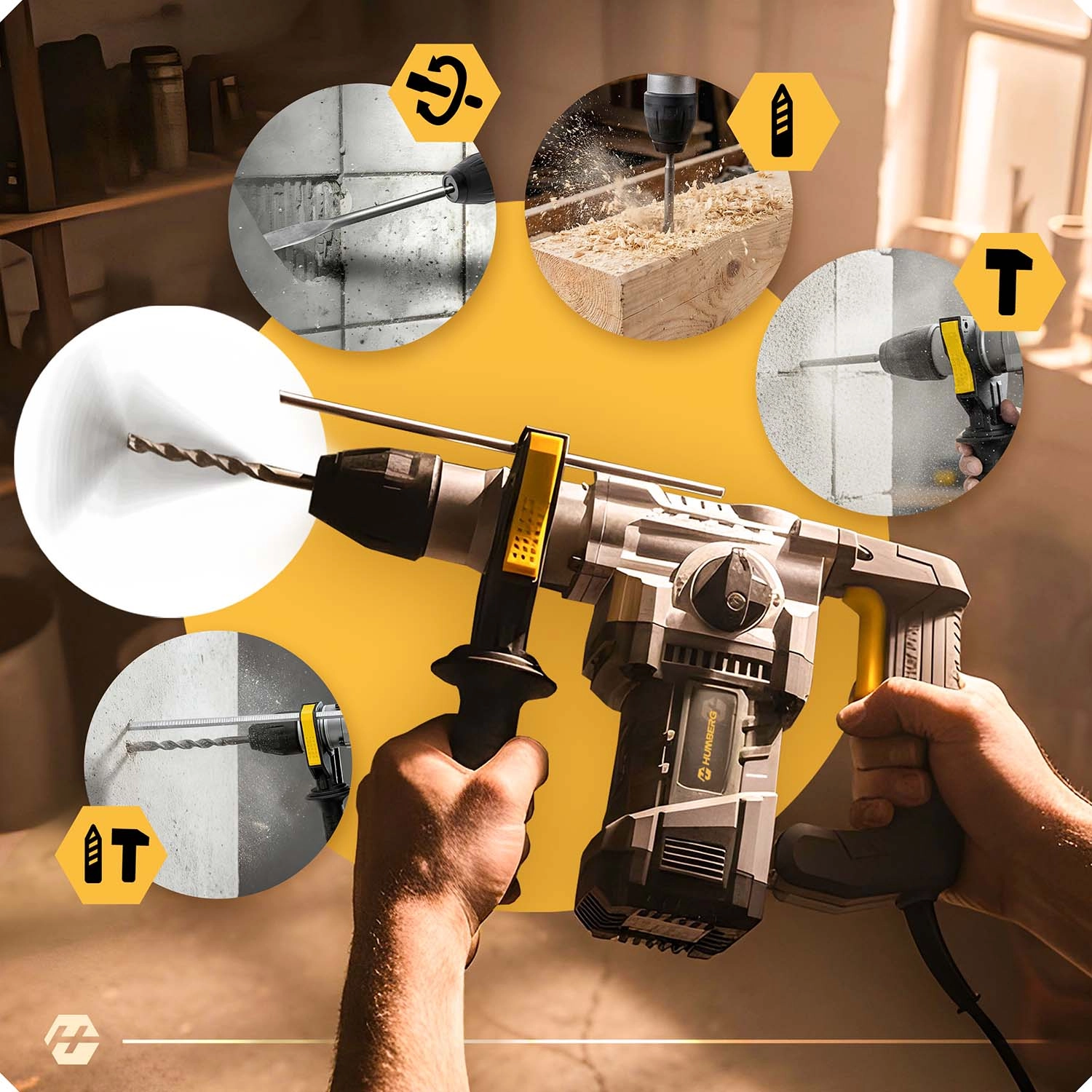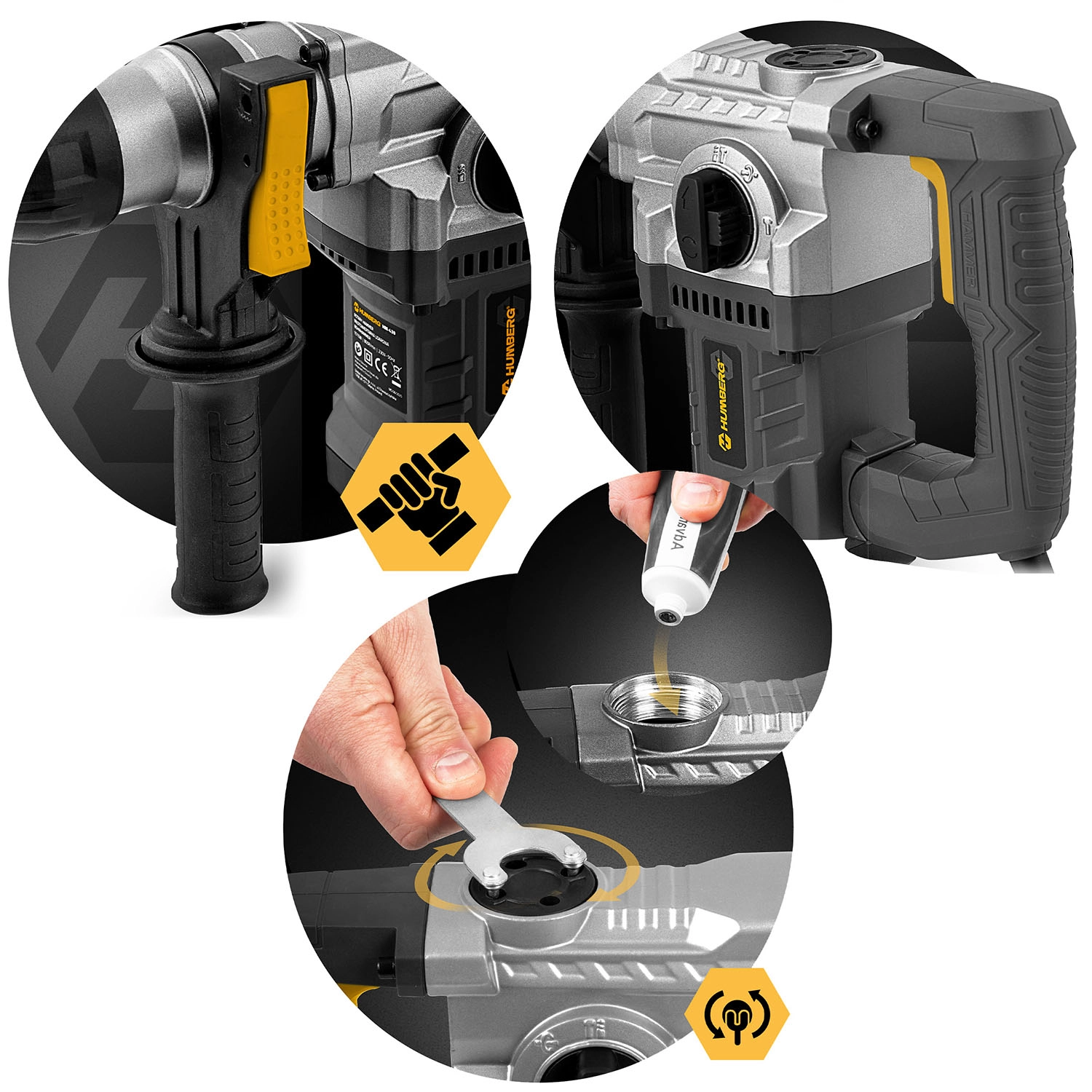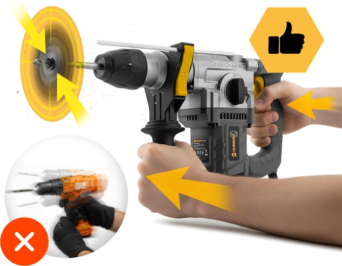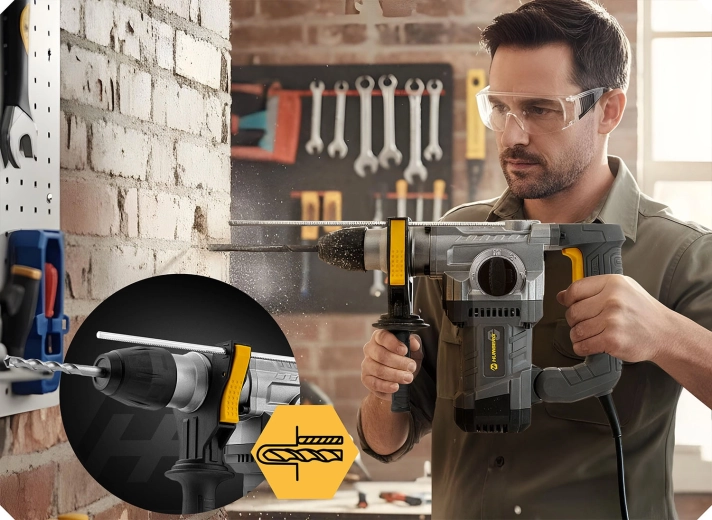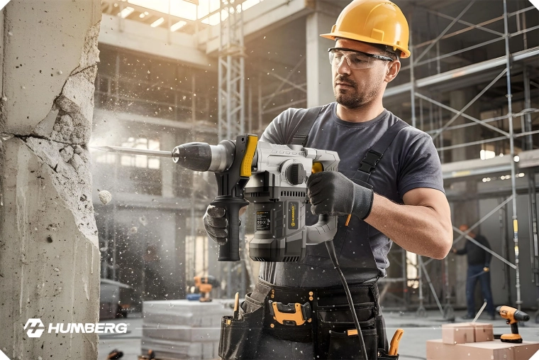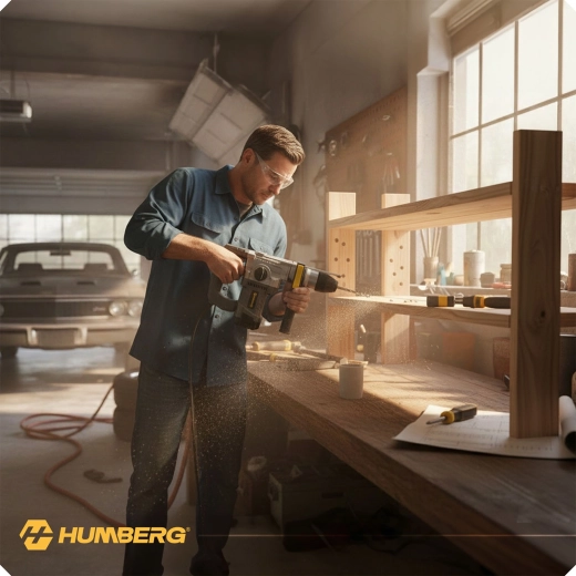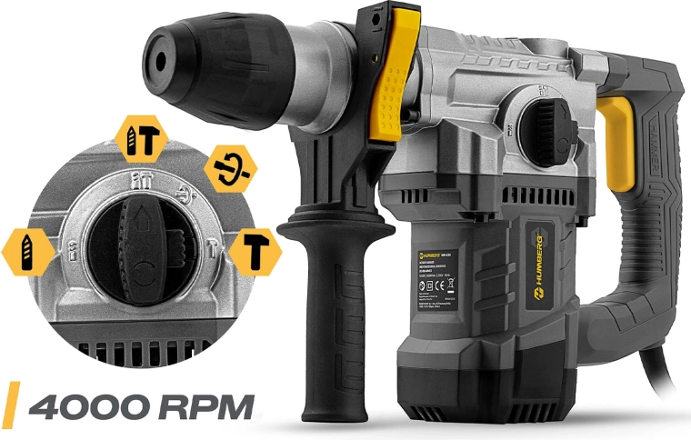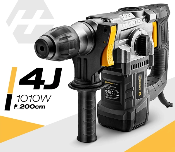 Kraftig slagborhammer HUMBERG med 1010 W motor og 4 J slagenergi klarer både boring og mejsling i beton, murværk, træ og metal. Hurtigt værktøjsskifte takket være SDS Plus-fatning, 4 arbejdstilstande og omdrejningsregulering for maksimal kontrol. Inkluderer rigt tilbehør i en robust kuffert og 2 m strømledning for komfortabelt arbejde.