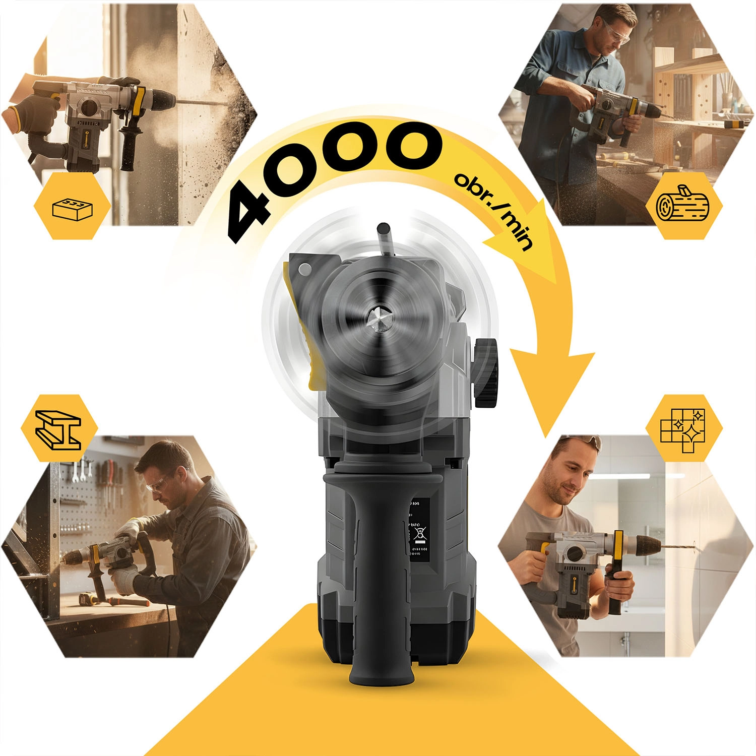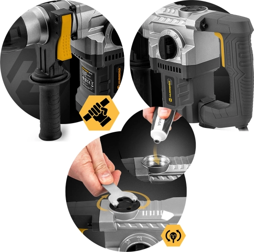 Kraft og præcision i ét – en robust kulmotor med effekt på 1010 W og slagenergi på 4 J giver høj effektivitet ved slagboring og mejsling. Omdrejningsregulering op til høje niveauer gør det muligt at tilpasse værktøjet til materialet, smøring af gearkassen forlænger levetiden, og blødt, antivibrationsgreb øger komforten selv ved længere tids brug.