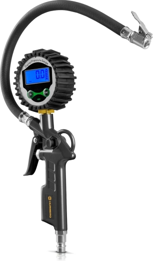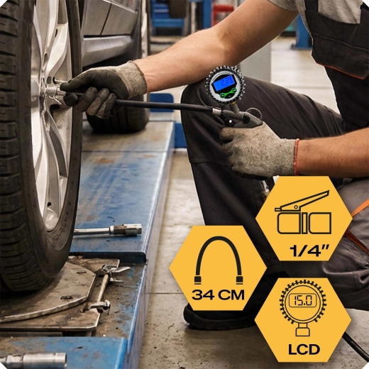Den fleksible slange på 34 cm øger arbejdskomforten, og den standard 1/4" tilslutning garanterer bred kompatibilitet med både værksteds- og hjemmekompressorer. Det robuste gummibeskyttede manometer skærmer enheden mod stød, så den er ideel til garage, værksted og på farten.