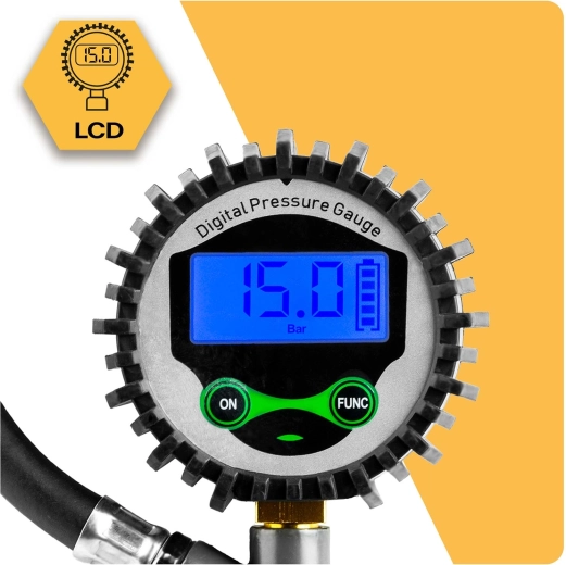 Klar og letlæselig skærm viser det aktuelle tryk med høj nøjagtighed selv under dårlige lysforhold. Enhedsskift (bar/psi/kPa/kg/cm²) med ét tryk.