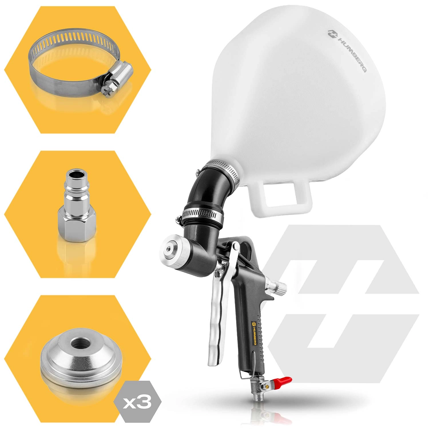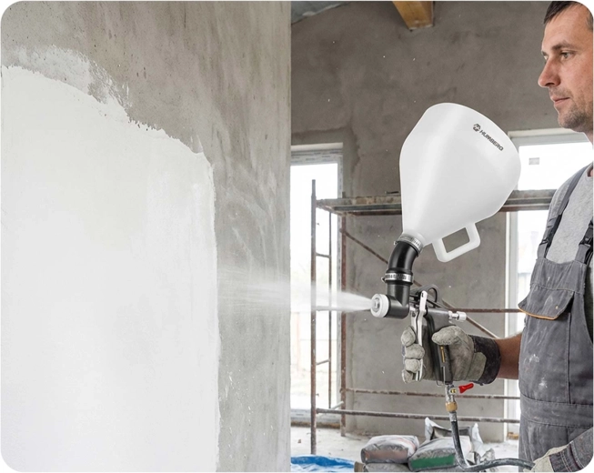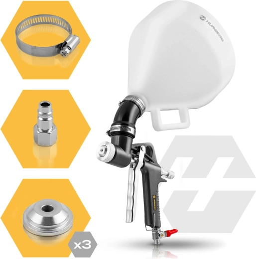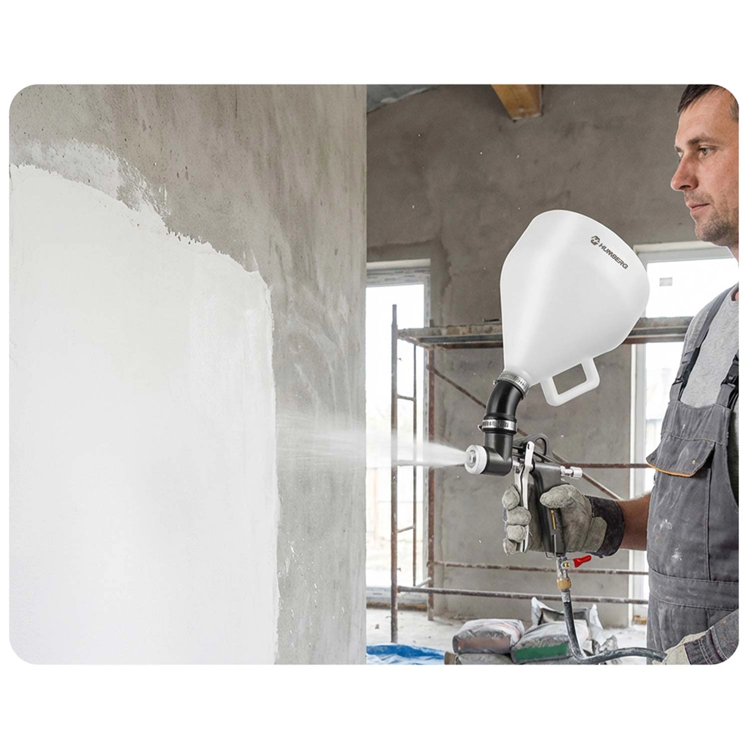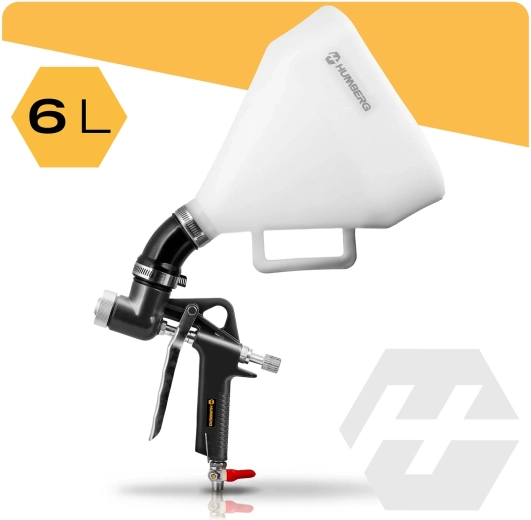 Den pneumatiske HUMBERG-pistol er et alsidigt værktøj til påføring af tyndlags- og strukturerede puds, spartelmasser og dekorative blandinger. Takket være den store beholder på 6 l kan du arbejde kontinuerligt uden hyppig genopfyldning, mens valget mellem 3 udskiftelige dyser gør det muligt præcist at tilpasse gennemstrømningen til materialets viskositet og den ønskede effekt.
