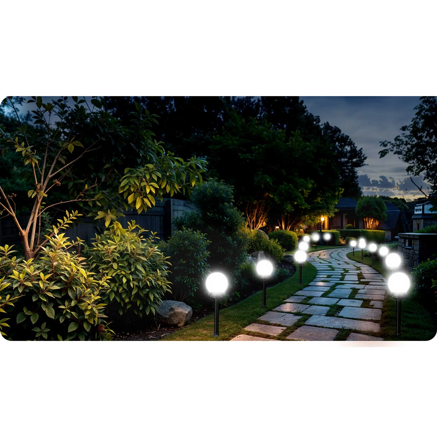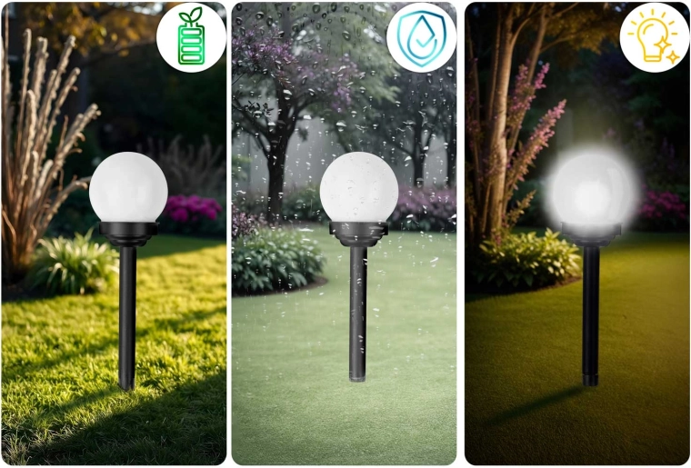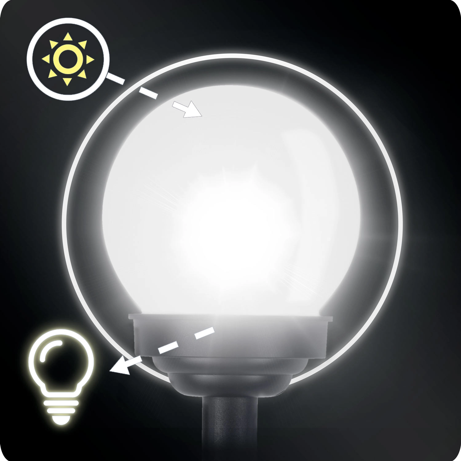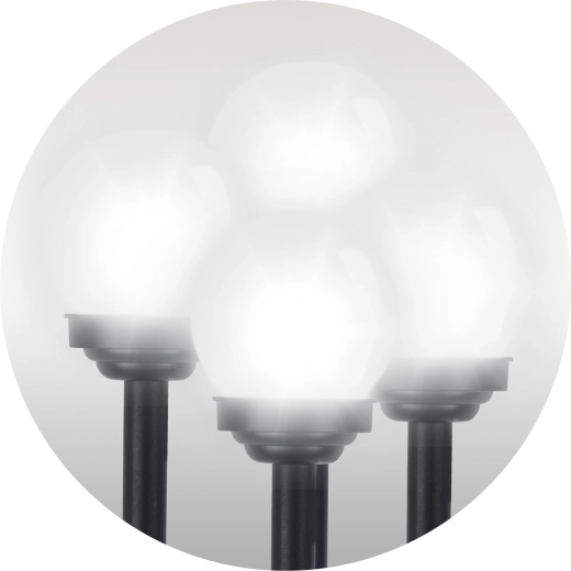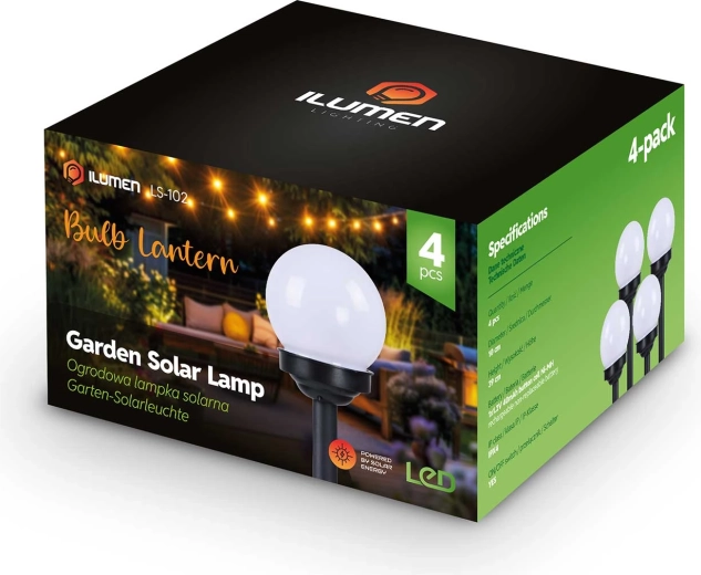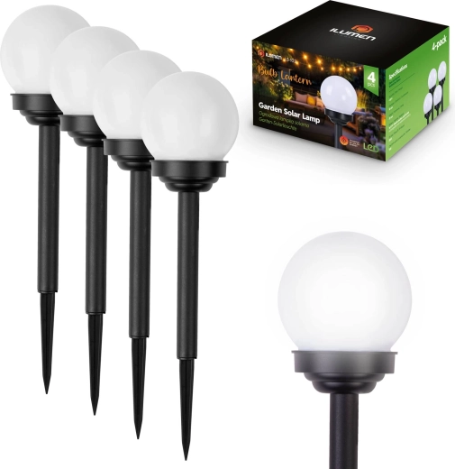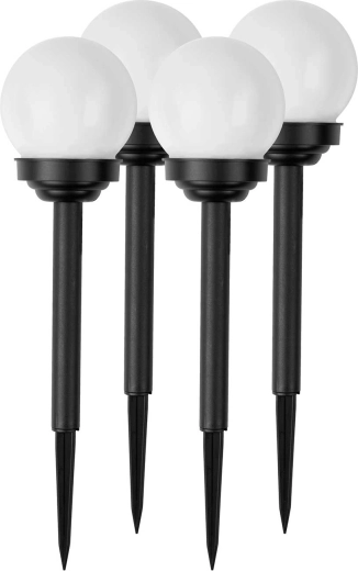 Forvandl din have til et magisk sted. Fire solkugler på jordspyd installeres nemt i græsplæne eller bede og tænder automatisk ved mørkets frembrud takket være lyssensoren. Det amorfe solpanel klarer også dårligere lysforhold, og Ni‑MH 150 mAh akkumulatoren sørger for behagelig aftenbelysning af stier og siddeområder.