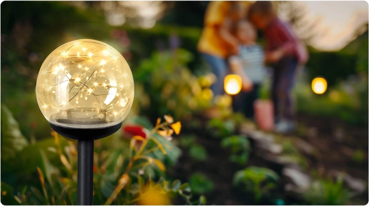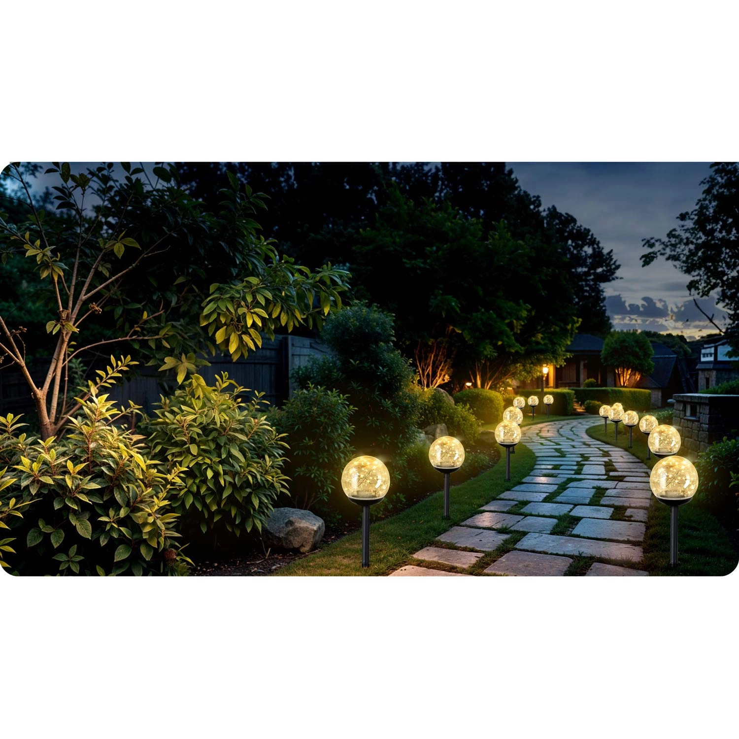 De gennemsigtige kupler med varme LED-lys spreder lyset smukt og fremhæver kurverne på stier og bede. Ideelle til orientering og en hyggelig atmosfære i skumringen.