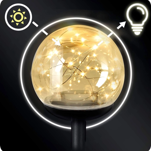 De solcelledrevne havelamper ILUMEN forvandler dit udendørsområde til en behageligt oplyst oase. De gennemsigtige kugler med fine LED-lys spreder et varmt lys jævnt og fremhæver sikkert stier, indgange og bede. Takket være de amorfe solpaneler oplades de pålideligt selv ved dårligere lysforhold, og det integrerede 150 mAh Ni-MH batteri leverer energi til aftensbelysning.