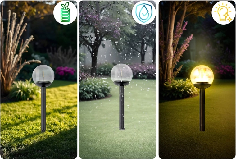 De amorfe paneler er effektive selv ved svagere lys, så lamperne oplader også på overskyede dage. Den integrerede lyssensor sørger for automatisk tænding efter mørkets frembrud, mens IPX4-vandafvisning beskytter mod stænk og regn. Kontakten ON/OFF gør det nemt at slukke i sæsonpauser.