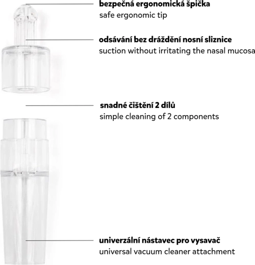 Det gennemsigtige mundstykke og et stabilt undertryk hjælper med hurtigt at frigøre næsehulen uden at irritere slimhinden – egnet allerede fra fødslen.