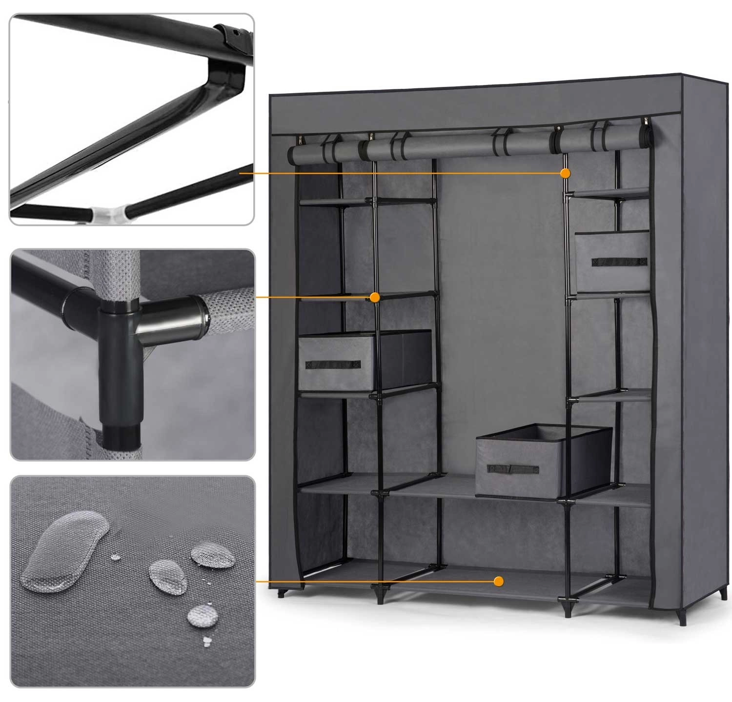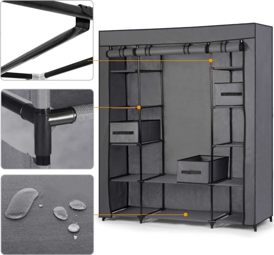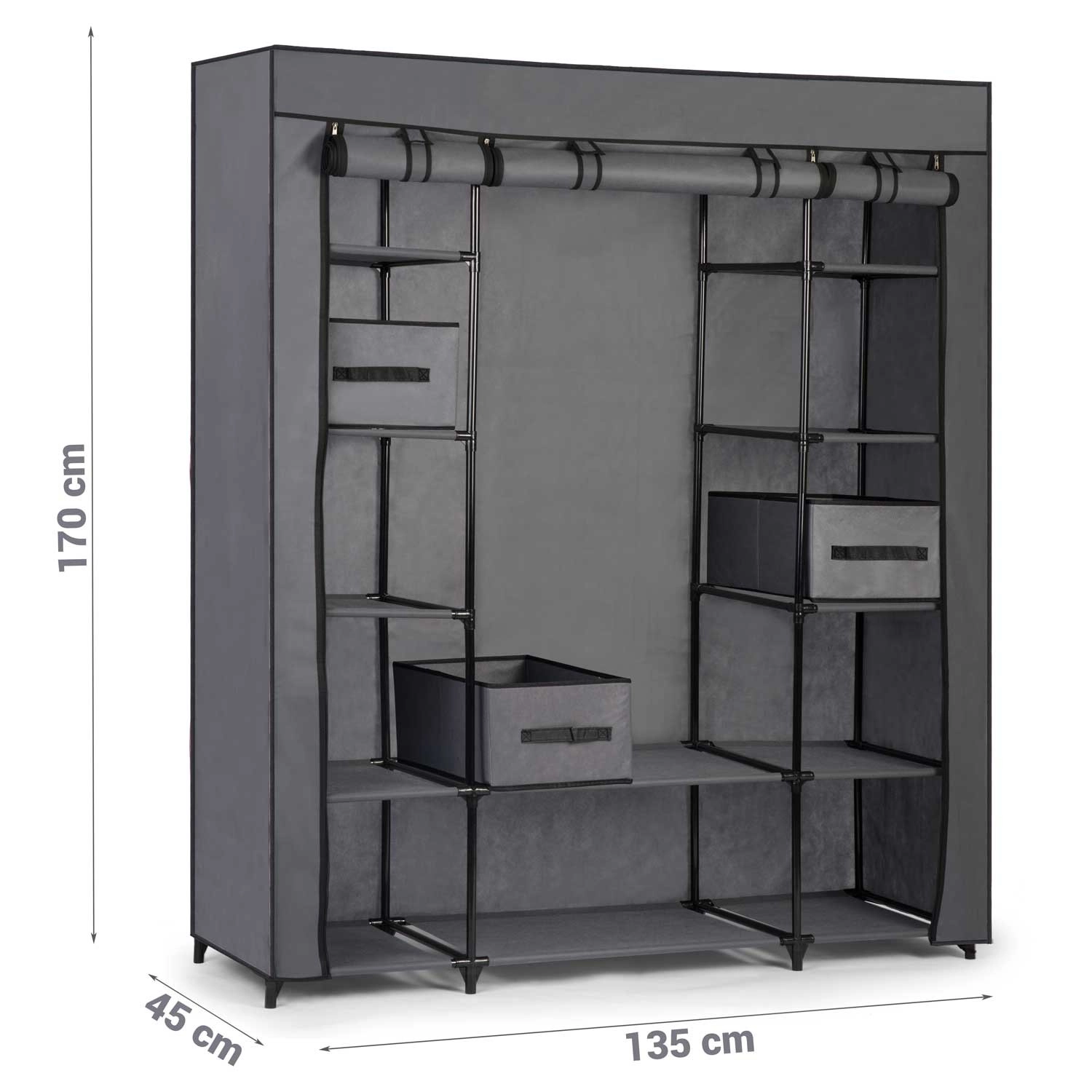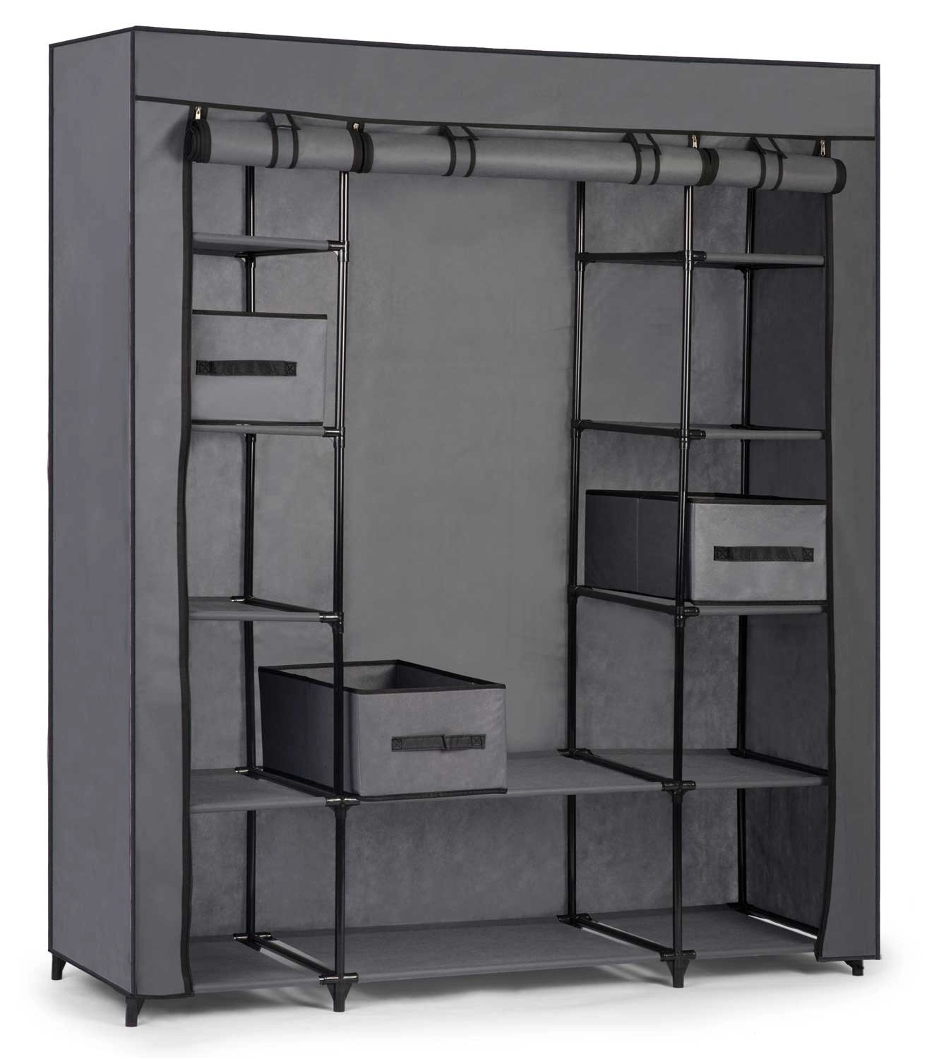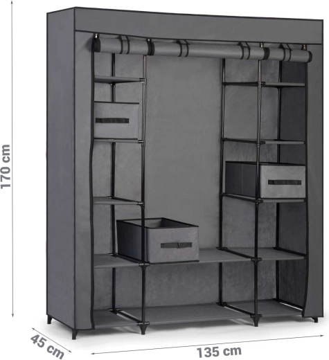 Den praktiske og robuste tekstilgarderobe Massido i elegant grafit tilbyder gennemtænkt opbevaring af tøj og accessories. Den har 12 hylder med højere bæreevne, 3 rummelige skuffer og en stang til bøjler. En stålramme og vandafvisende materiale sikrer lang levetid. Tre separate zoner med egne døre og fire lynlåse gør daglig brug og organisering lettere. Samlingen er hurtig og intuitiv.