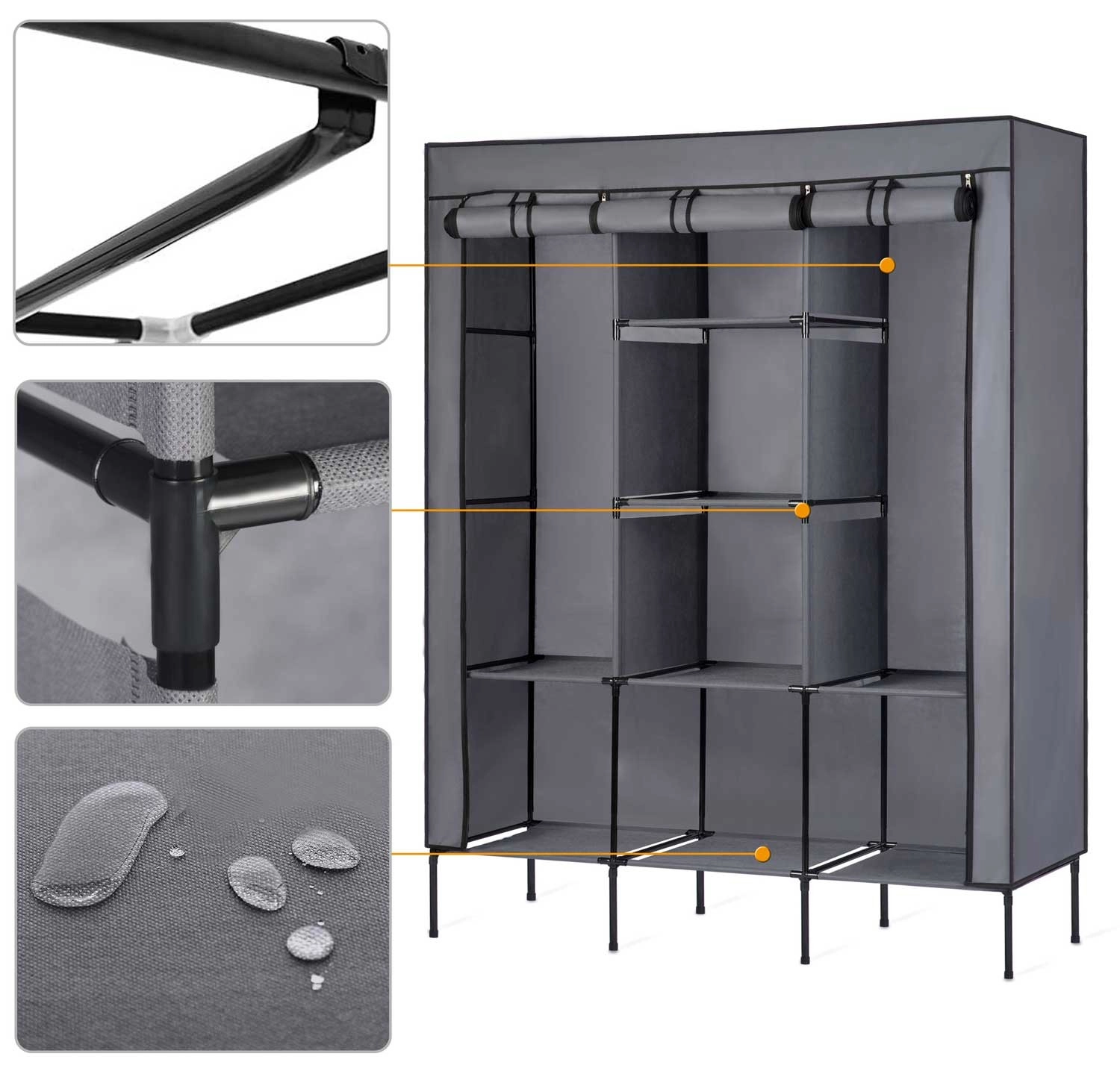Det praktiske tekstilgarderobeskab Massido i elegant grafit tilbyder 8 solide hylder, 2 garderobestænger og en stålramme for stabilitet. Tre adskilte zoner med egne døre med lynlås beskytter tøjet mod støv. Nem og intuitiv montering sparer tid, og det vandafvisende materiale sikrer lang holdbarhed.