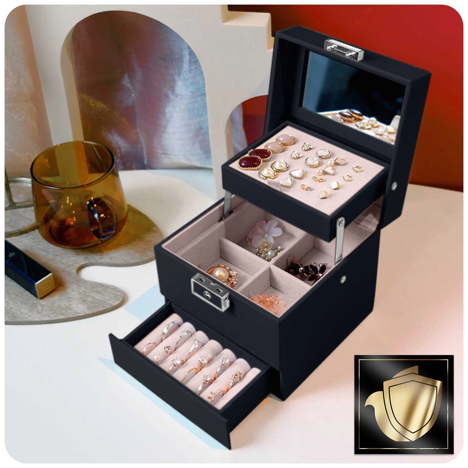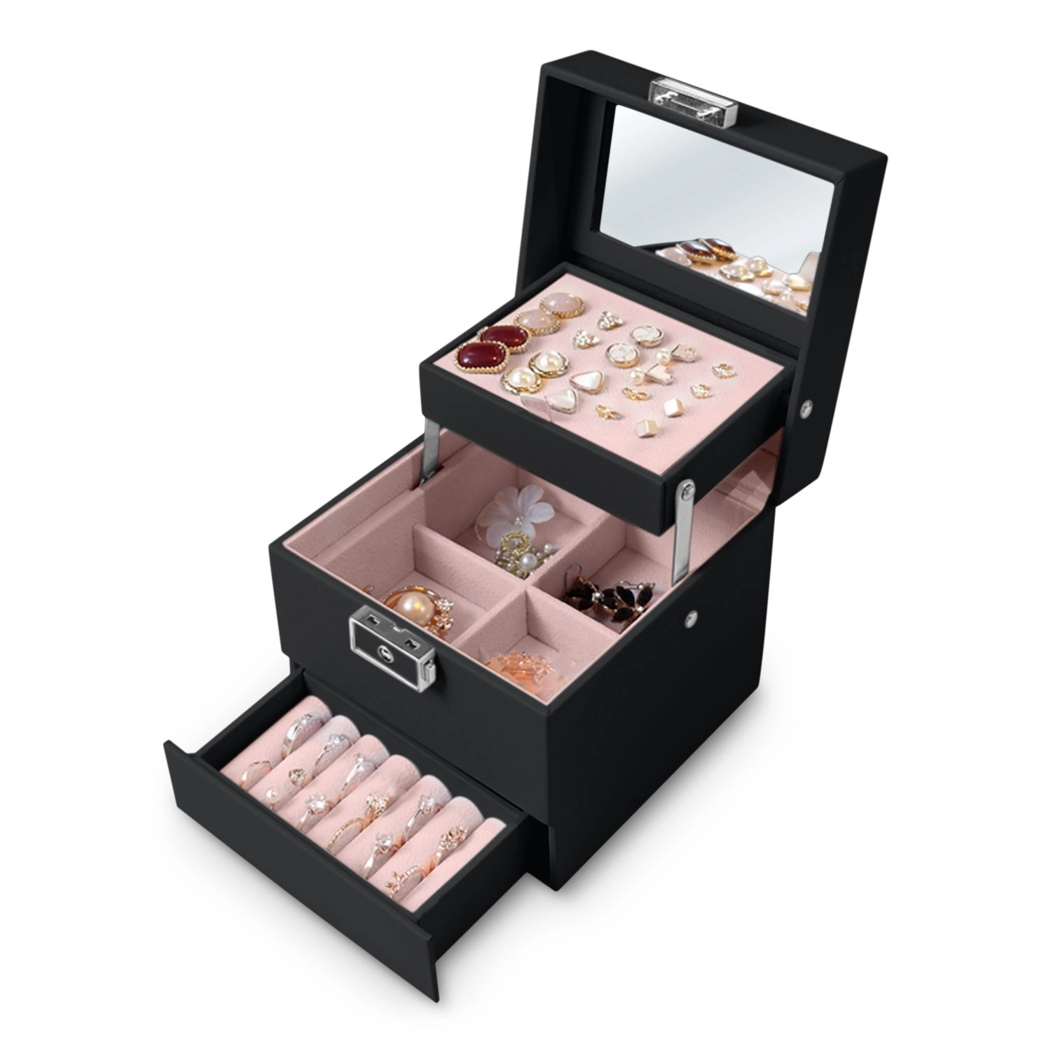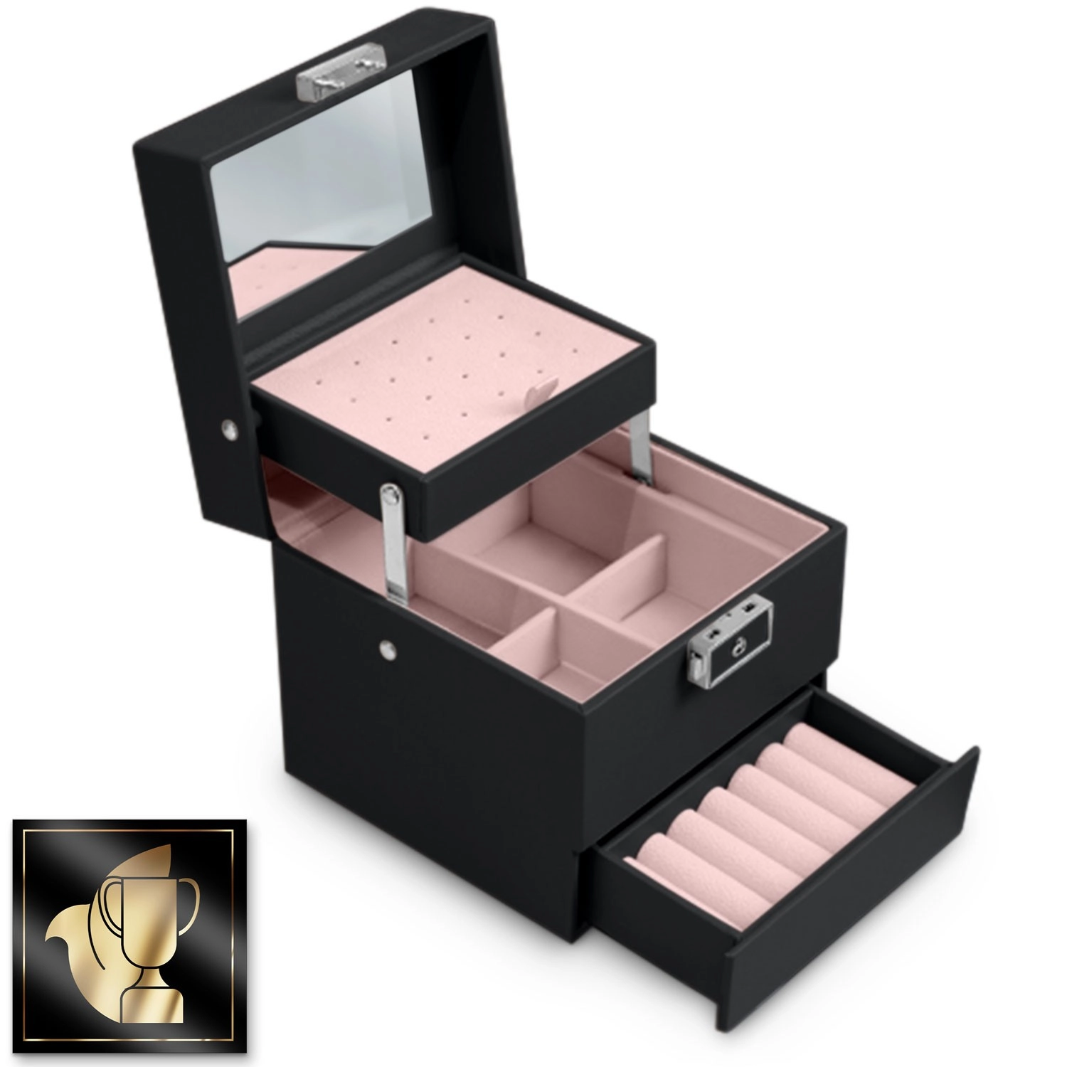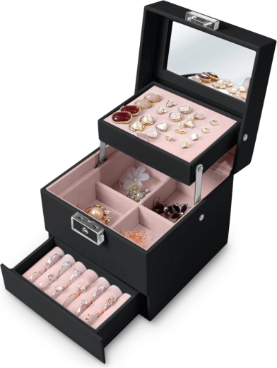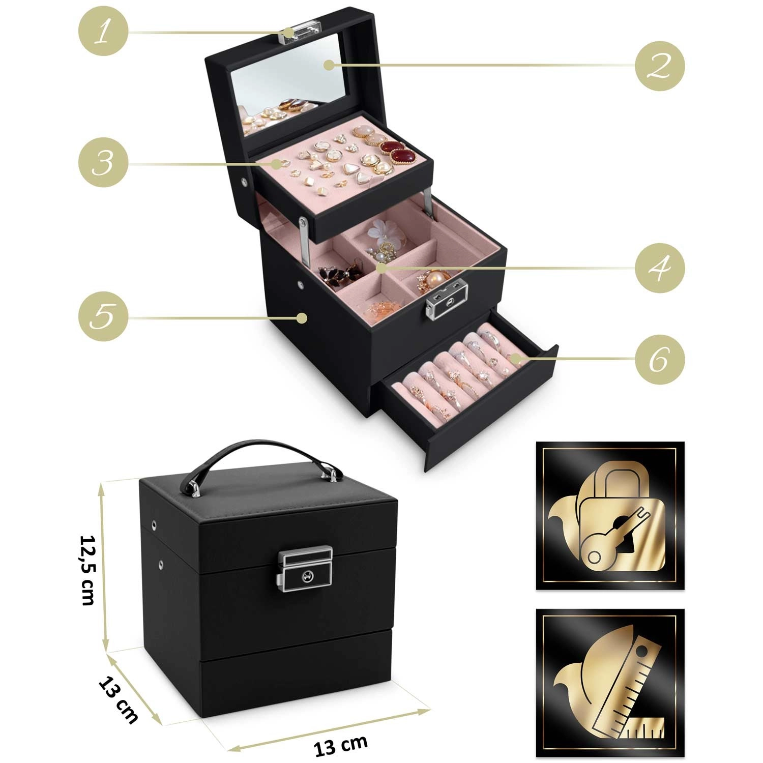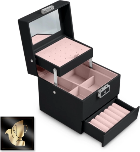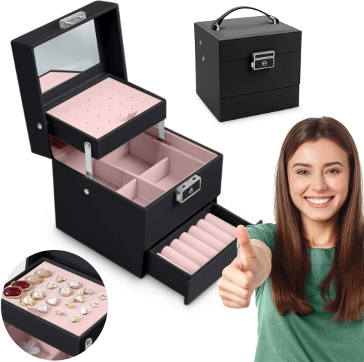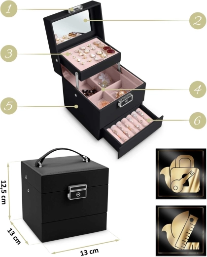 Oplev det perfekte, organiserede sted til din bijouteri. Dette kompakte og stilfulde smykkeskrin udmærker sig ved gennemtænkt inddeling og kvalitetsforarbejdning. Den låsbare mekanisme beskytter indholdet mod utilsigtet åbning, mens det indvendige spejl gør det nemt at prøve smykker, når som helst du har brug for det.