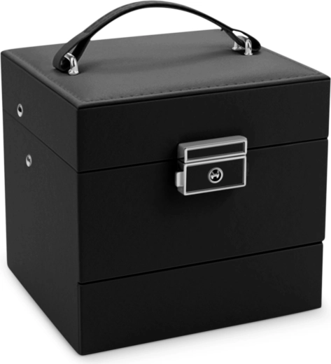 Overfladen i slidstærkt PU økolæder modstår slid, og takket være det øverste håndtag er smykkeskrinet let og bekvemt at bære.