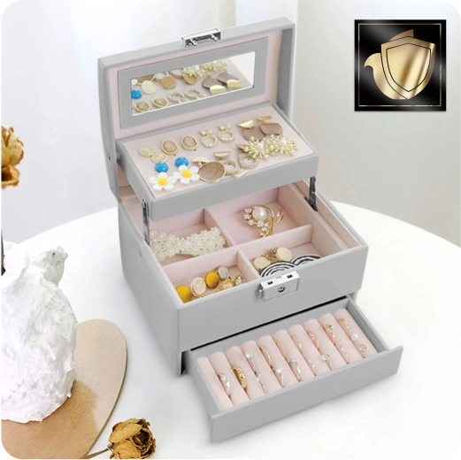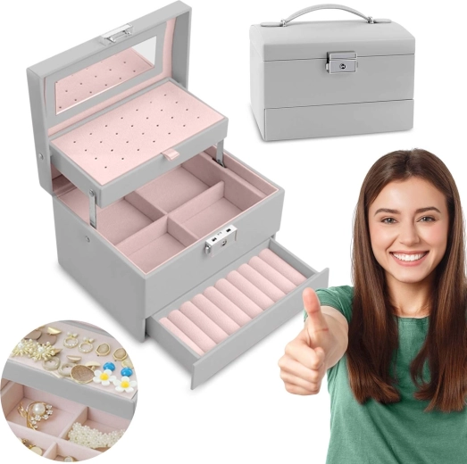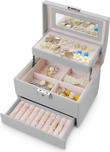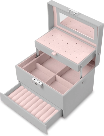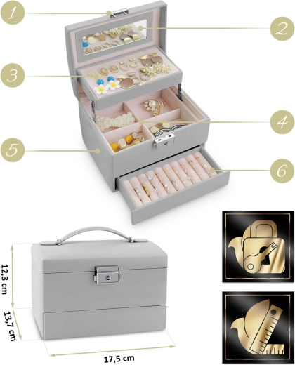 Det elegante grå smykkeskrin MASSIDO MS-704 kombinerer en stilfuld design, gennemtænkt organisering og sikker opbevaring af smykker. Takket være lås med nøgle, praktisk bærehåndtag og let konstruktion er det ideelt både hjemme og på farten. Indvendigt finder du et spejl, overskuelige rum, plads til øreringe og ringe samt udtagelig inddeling for nem udvidelse af pladsen.