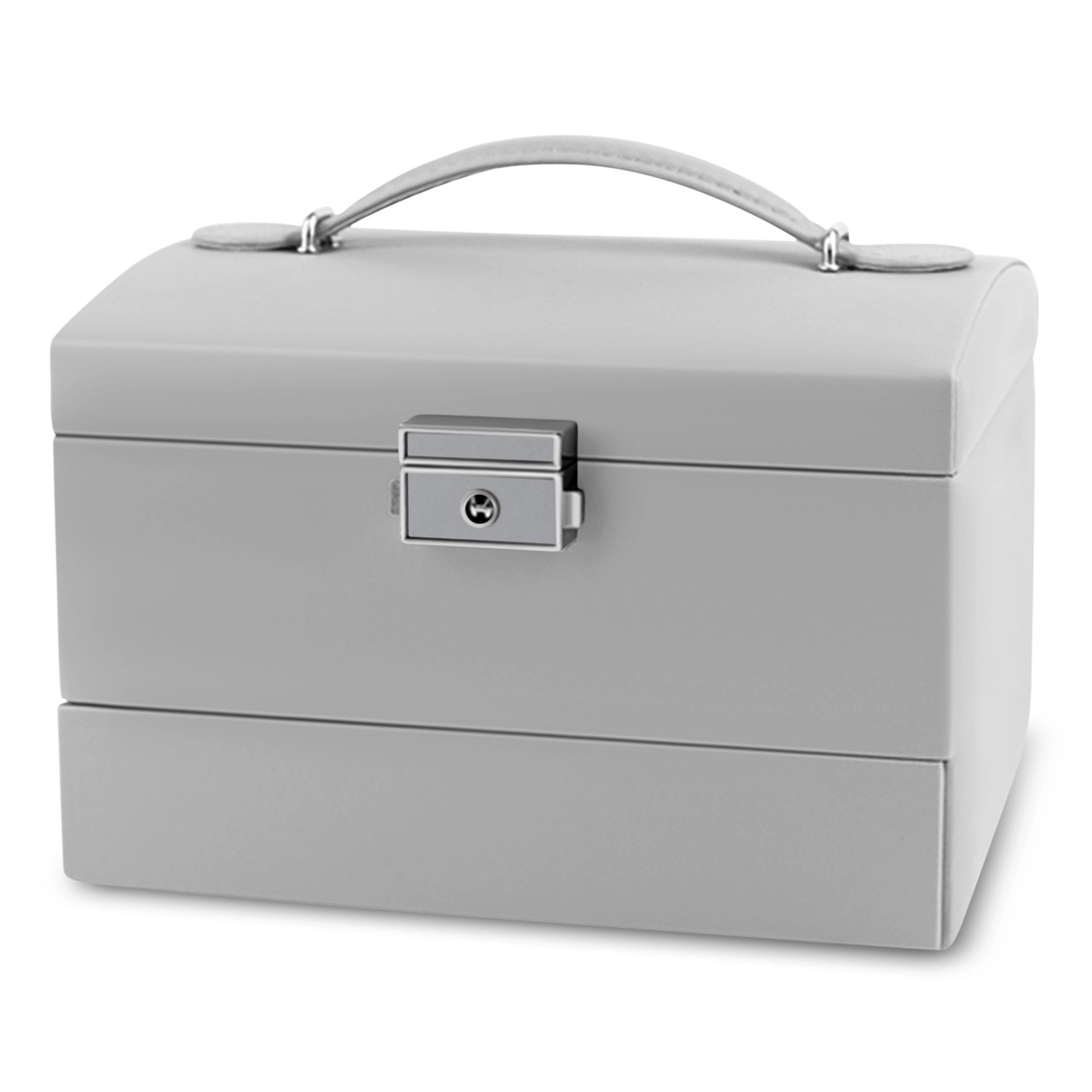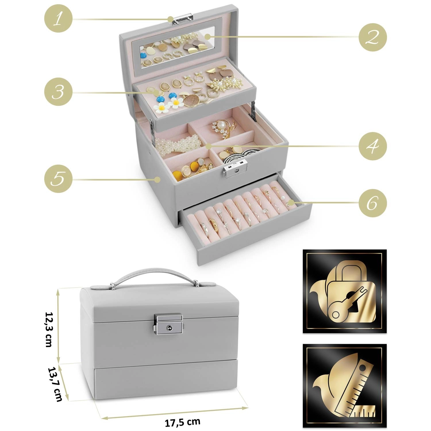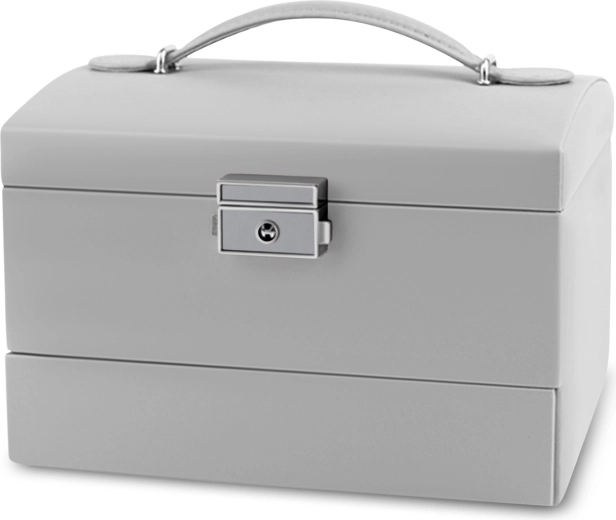 Takket være nøglelåsen åbner smykkeskrinet ikke utilsigtet under transport og forbliver sikkert. Det ergonomiske håndtag og den lette konstruktion gør det til en fremragende rejsepartner og et elegant tilbehør til toiletbordet.